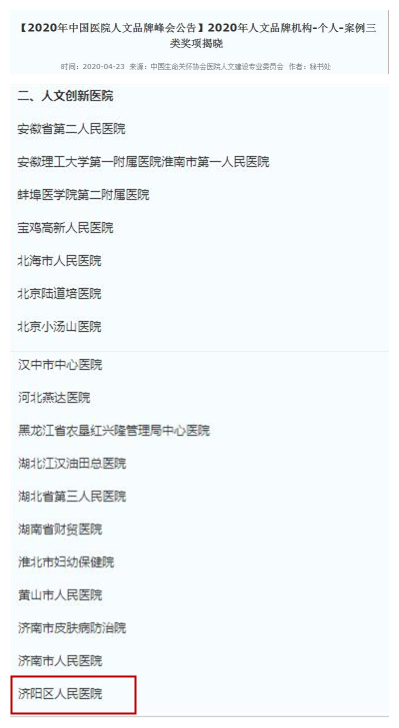 在中国生命关怀协会主办的“第二届中国人文品牌医疗机构、团队、个人奖项推选”活动中,我院获得“人文创新医院”荣誉称号。