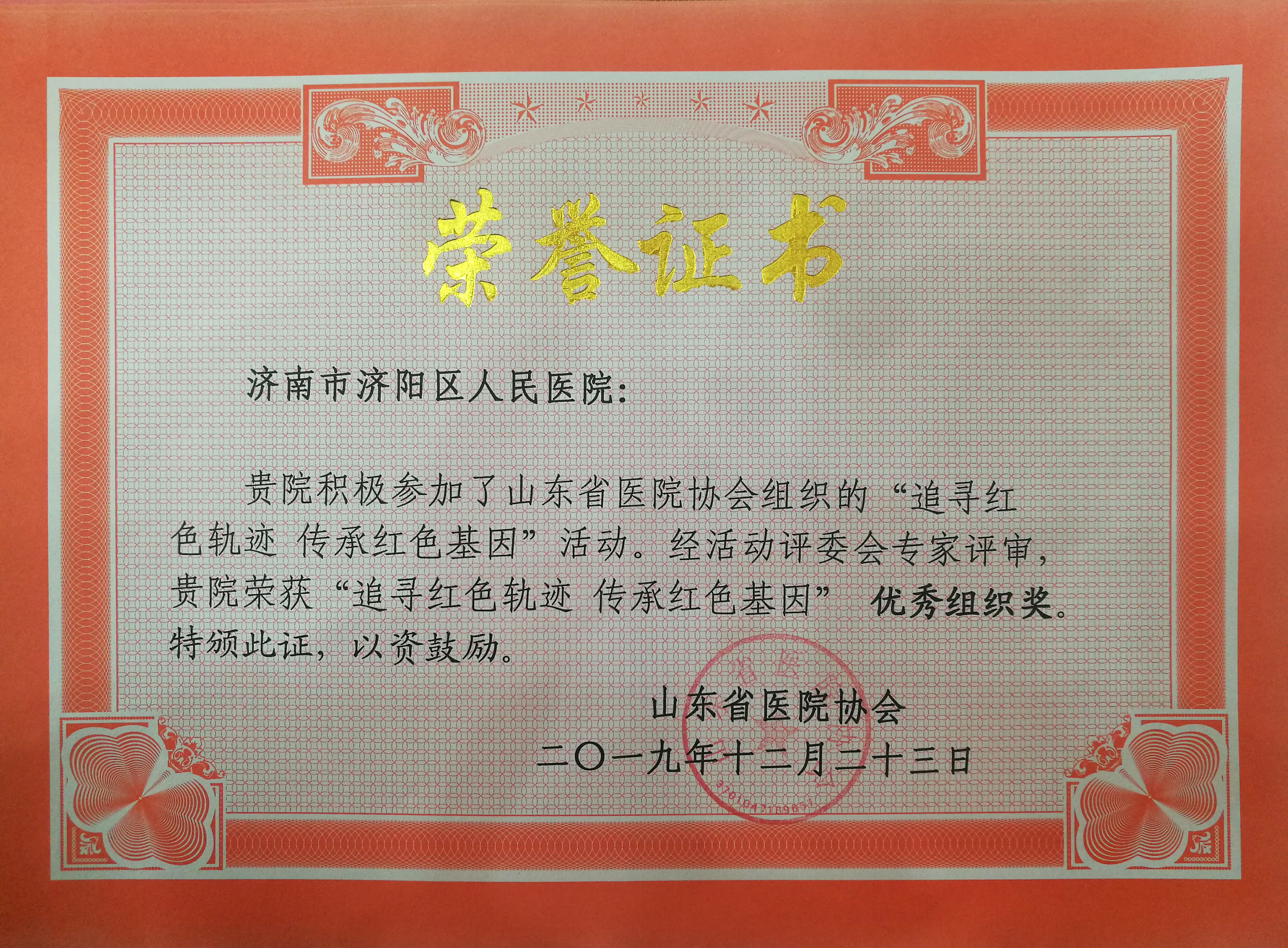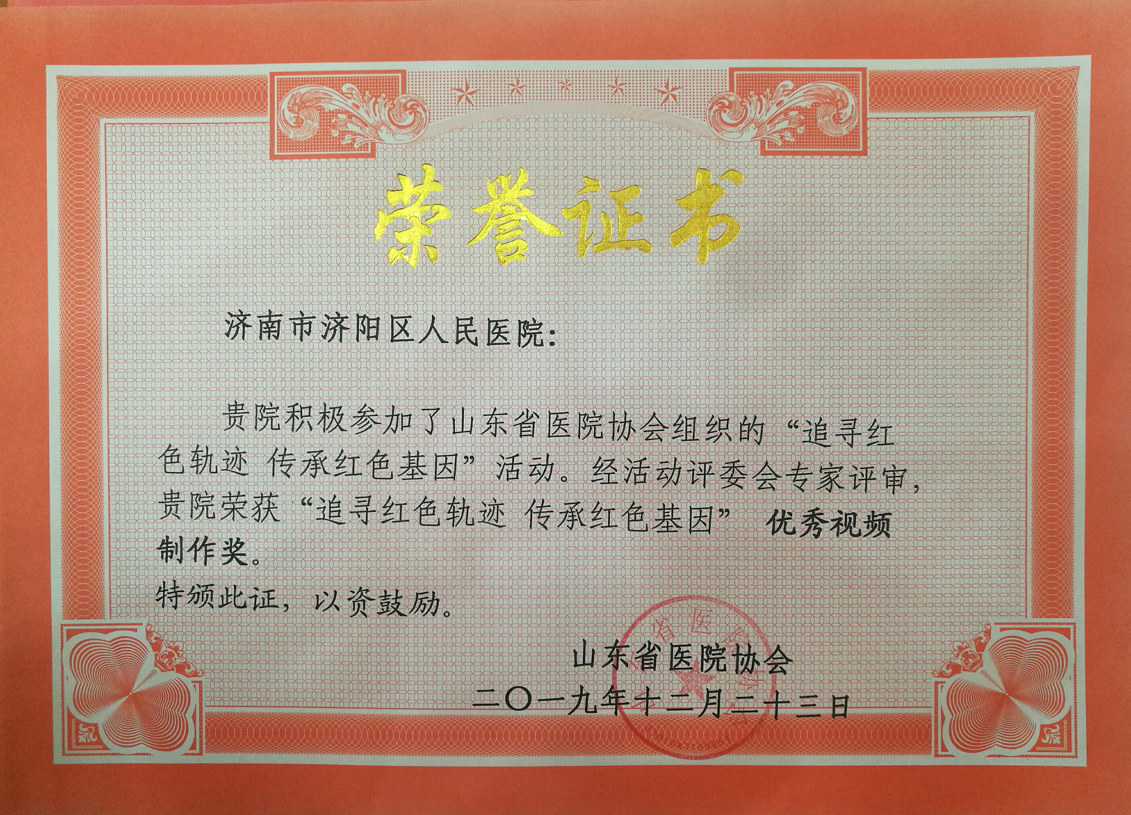 2020年初,医院七十周年纪录片《欣欣向荣 生生不息》在山东省医院协会“追寻红色轨迹 传承红色基因”评选活动中,获得“优秀视频制作奖”,医院同时获得“优秀组织奖”。