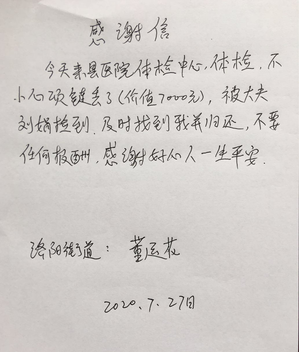 ● 这一天,单位体检的人员络绎不绝,查体中心工作有条不紊。临近尾声,护士刘娟在整理体检仪器时,无意中发现地上有一条被人遗落的金项链。刘护士立刻想到在这台机器做体检的人员并不多,只有两名女士,遂报告科主任,寻找失主。与此同时,刚体检完回到家中的济阳街道董女士发现自己价值7000元的金项链不见了,心急之下原路返回,来到查体中心寻找。工作人员核对董女士所说信息后,确定该金项链确实为董女士在体检时无意掉落的。失而复得的董女士,感激不已,各种答谢都被刘护士委婉拒绝之后,激动地当场写下感谢信,祝愿“好人一生平安”。在场的查体中心人员也纷纷竖起大拇指,为刘护士点赞,称她是一名党员,平时工作勤恳务实,为人友好和善。