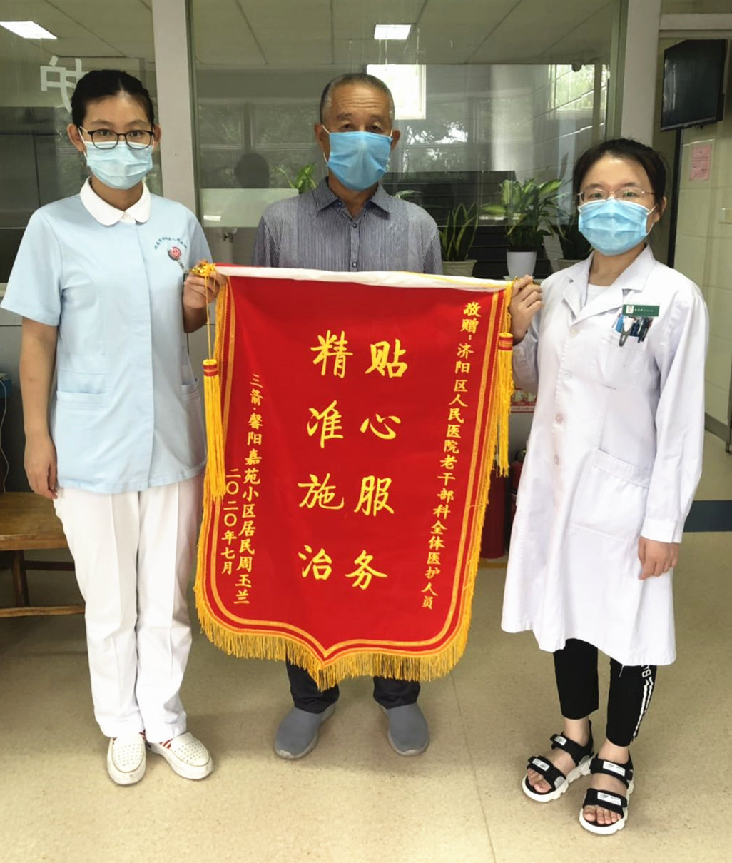 87岁高龄的周奶奶既往有脑萎缩病史10余年,有记忆力减退后遗症,近日因双下肢无力一天住进老干部科。住院期间,医护人员精心治疗护理,虽然她总是把医护人员记错,但每次见面都特别亲切。目前周奶奶病情恢复良好,其儿子特赠送锦旗表示感谢。然而比起这锦旗带来的荣誉,更值一提的是老干部科与周奶奶一家的深厚情谊。周奶奶的老伴儿是一名离休干部,近几年来偶有小恙都会来老干部科调理,也成了科里的“老熟人”,每次医护人员同样是精心诊治、悉心护理。彼时,老人住院期间,他的儿女都会送来感谢信和精心拍摄的科室医护人员工作照作为留念。
