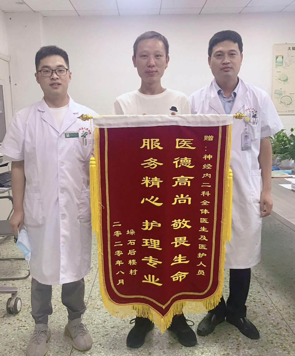 8月6日,神经内二科患者周爷爷的家属将一面写有“医德高尚,敬畏生命;服务精心,护理专业”的锦旗送到医生办公室,以表示对全科医护人员的感激之情。