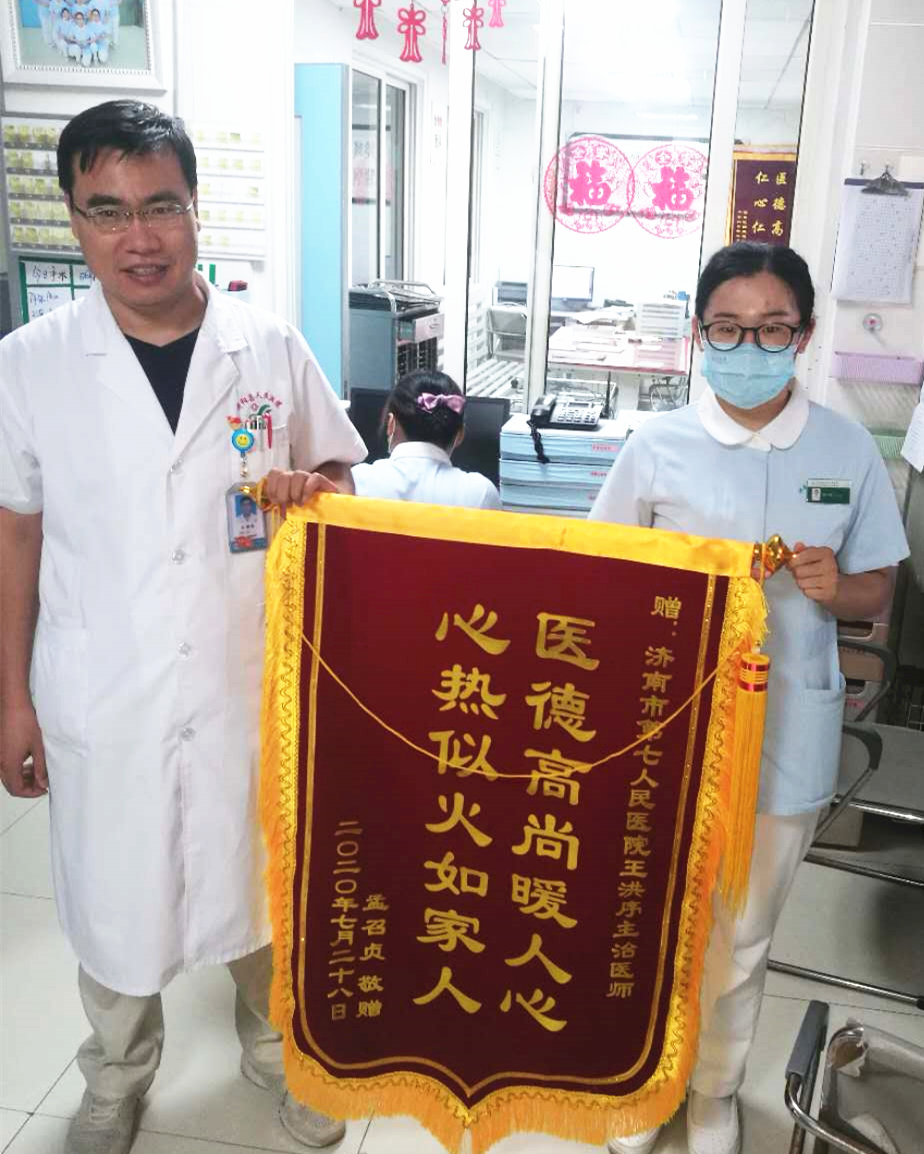 近日,普外一科患者的子女将一面标有“心热似火如家人,医德高尚暖人心”的锦旗送到主治医师王洪序手中,感谢王医生医者仁心及时为母亲解除病痛。