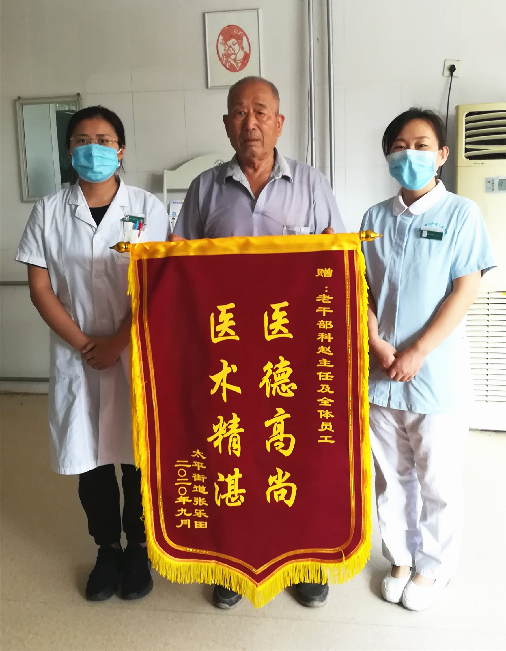 老干部科患者王大娘的家人送来了一面写有“医德高尚 医术精湛”的锦旗,以表达对赵娜主任、杜芳护士长及科室全体人员的感激之情。