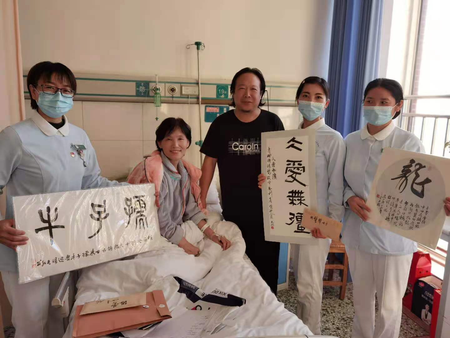 患者洪女士,52岁,因喘憋、气短、咳嗽咳痰等症状反复2月余,口服药物治疗后疗效不佳。近期症状加重,在其同学的建议下,来到区人民医院呼吸内科就诊。刘爱华副主任接诊,为患者安排完善的相关检查,次日组织相关科室会诊,考虑系阻塞性肺炎,与患者家属详细解释患者病情。住院期间,主任及护士长根据患者病情及时调整治疗方案,医护一体化查房,结合患者病情制定具体的治疗及护理方案;经过20多天的治疗,洪女士说:“我的身体也是经历过大风大浪的,能够一次次挑战自我,离不开全体医护人员的照顾。”洪女士即将康复出院,患者家属感念呼吸内科医护精湛医术,优质服务,特送上墨宝表达感激之情。