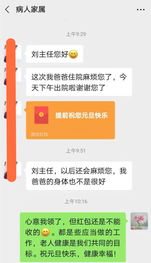 刘爱华主任考虑到急性和反复大咯血随时会引起患者窒息或失血性休克,为及时抑制病情加剧,立即安排相关检查。“患者血氧很低,情绪紧张,呼吸困难,生命体征非常不稳定,随时有生命危险!”刘主任立即组织科室医护团队抢救,并反复叮嘱患者绝对卧床。经过及时救治,张先生病情趋于稳定,在住院的12天里,刘主任多次查房,根据病情调节治疗方案,加之护理人员的周到护理,很快张先生成功脱离生命危险,计划元旦当天出院。2021年元旦前一天,患者女儿为表达谢意,希望日后如有需要能再请刘主任帮忙,便给刘主任微信转账发了红包。刘主任婉言谢绝,并宽慰她:“请放心,无论何时,我们都会为患者尽最大努力”。 元旦当天,患者如期出院,全家人如释重负。