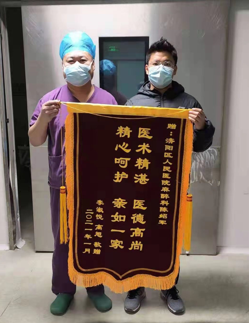 手术当日,麻醉医生陈绍军提前将麻醉用品及婴儿抢救用品备齐,麻醉迅速而有效,术中李女士麻醉非常平稳,手术非常顺利,母子平安。为表感激之情,李女士家属特赠送锦旗。