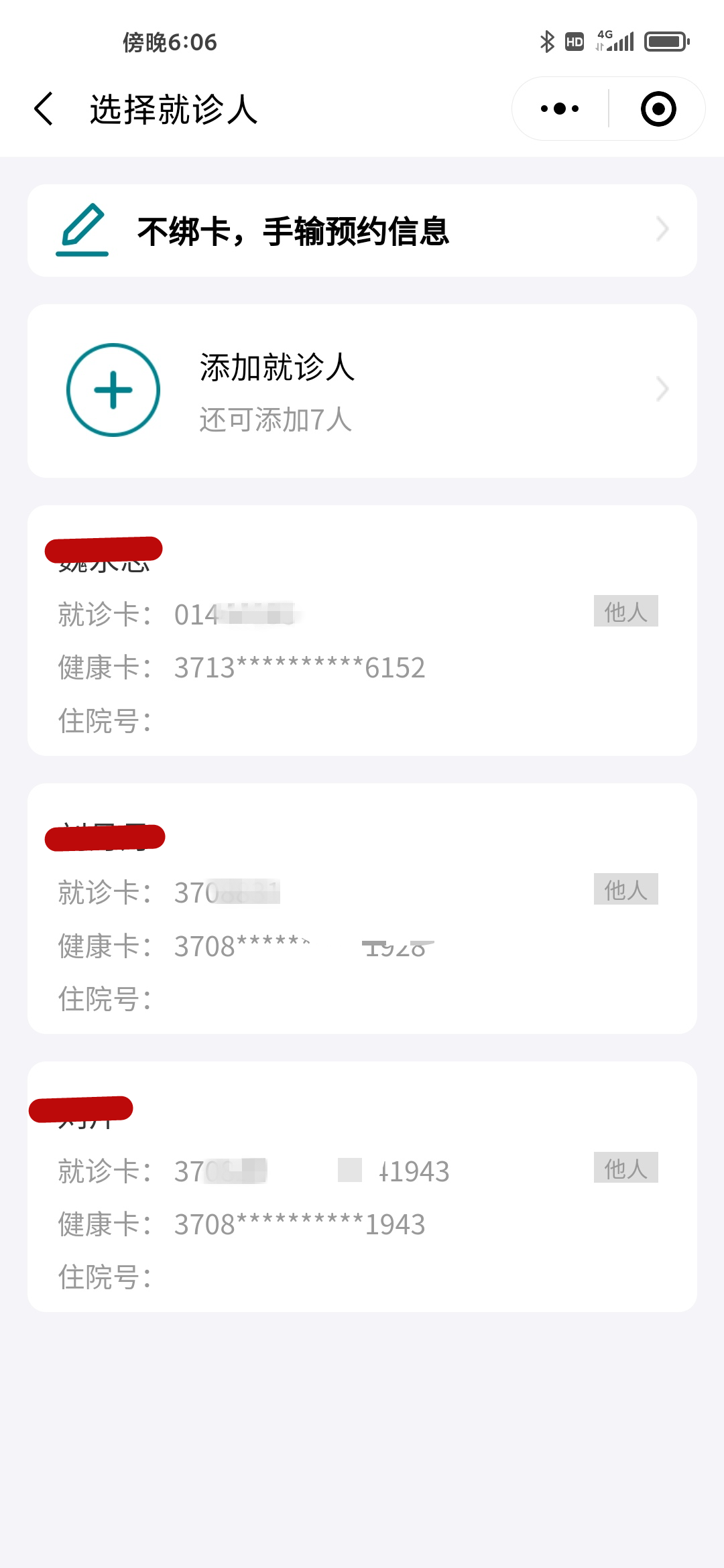 根据提示选择就诊人、填写预约信息(已领取电子健康卡用户可直接预约,有卡用户可绑定,无卡用户可在线建档)。如下图:
