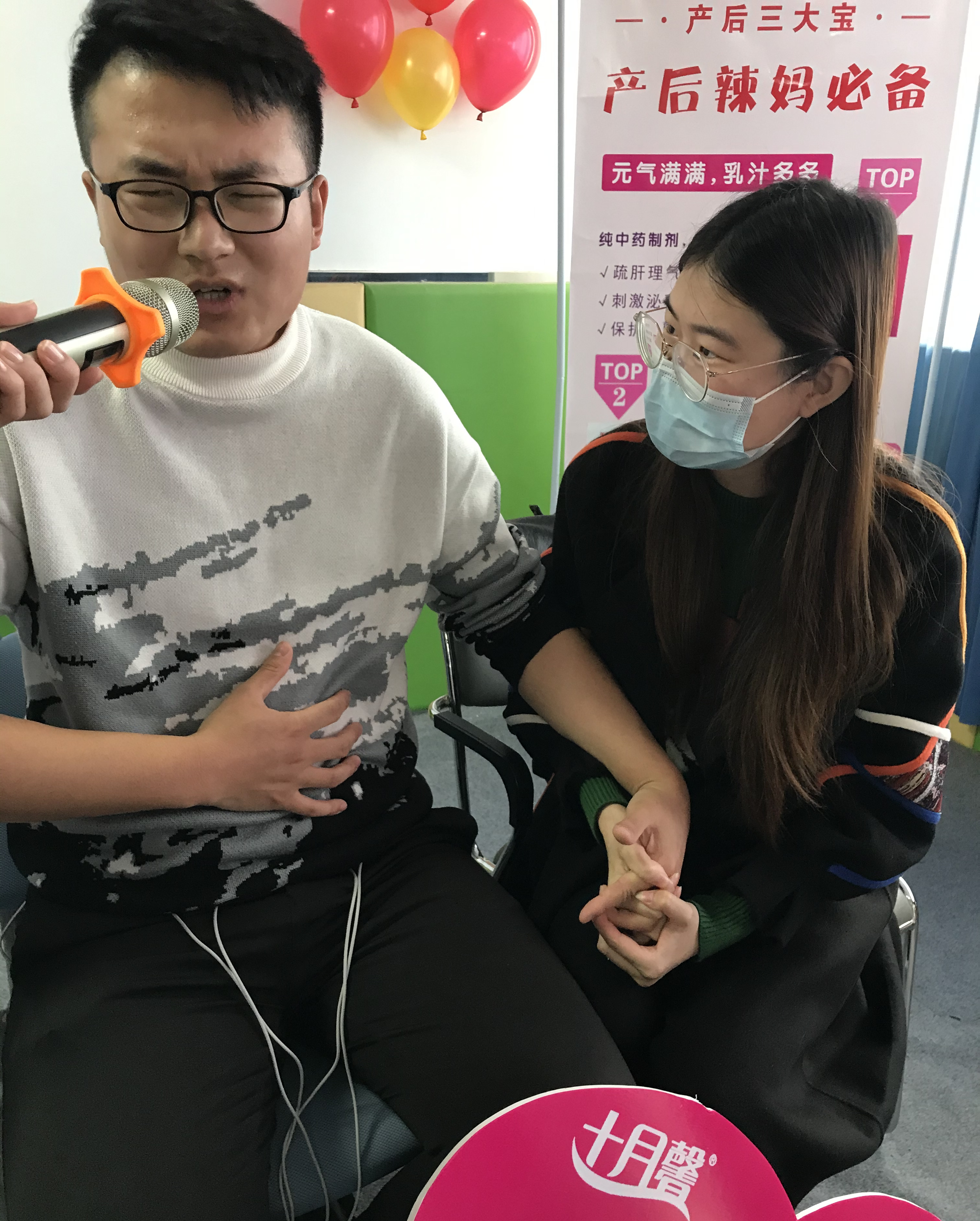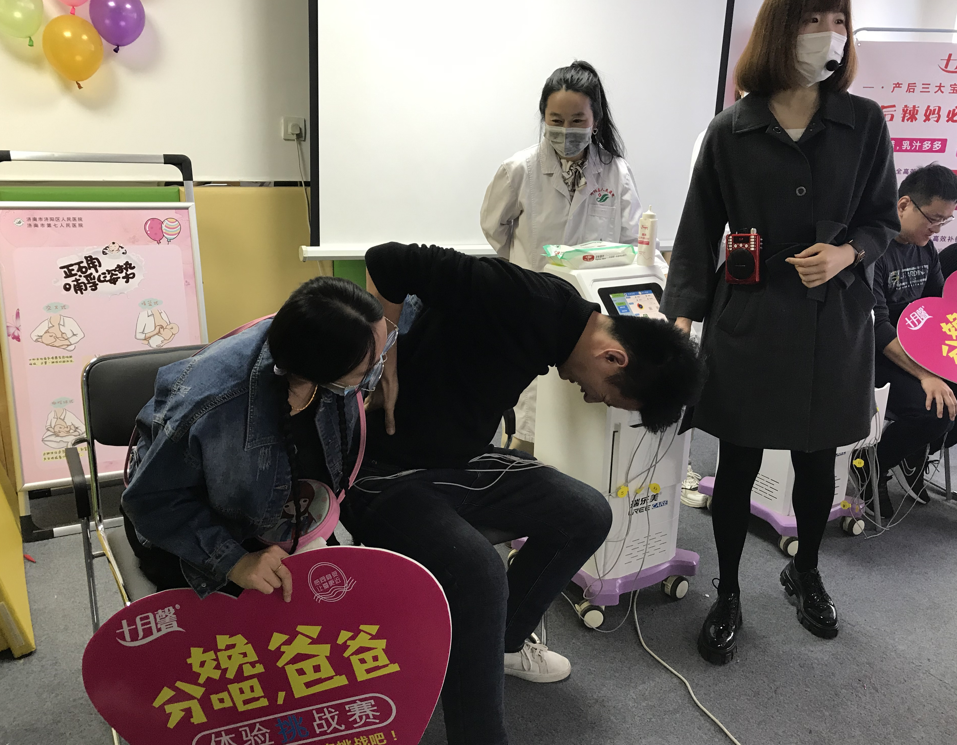 在分娩阵痛体验环节,从1级到10级全程耗时约10分钟。准爸爸们在绑好电极片和腰带后,由1级开始逐步增加等级,以达到产妇分娩阵痛的效果,并根据自己的承受能力向妻子申请“剖宫产”或“顺产”,再由妻子来决定是否放弃体验。