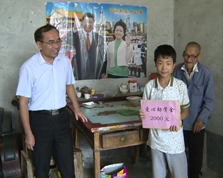 院长卢士平亲手将第一笔基金2000元交给了小双喜的爷爷,并鼓励双喜好好学习,孝敬爷爷奶奶。