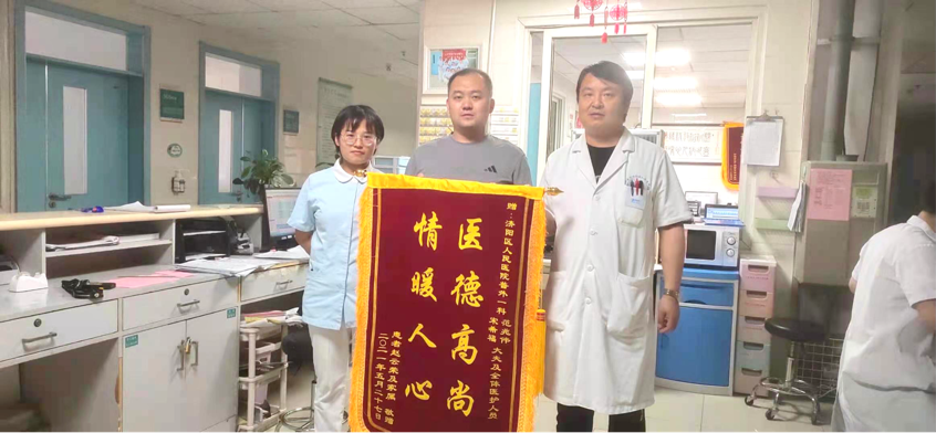 5月27日,两位即将出院患者委托家属将两面锦旗送到普外一科,以表对全体医护人员的感激之情。
