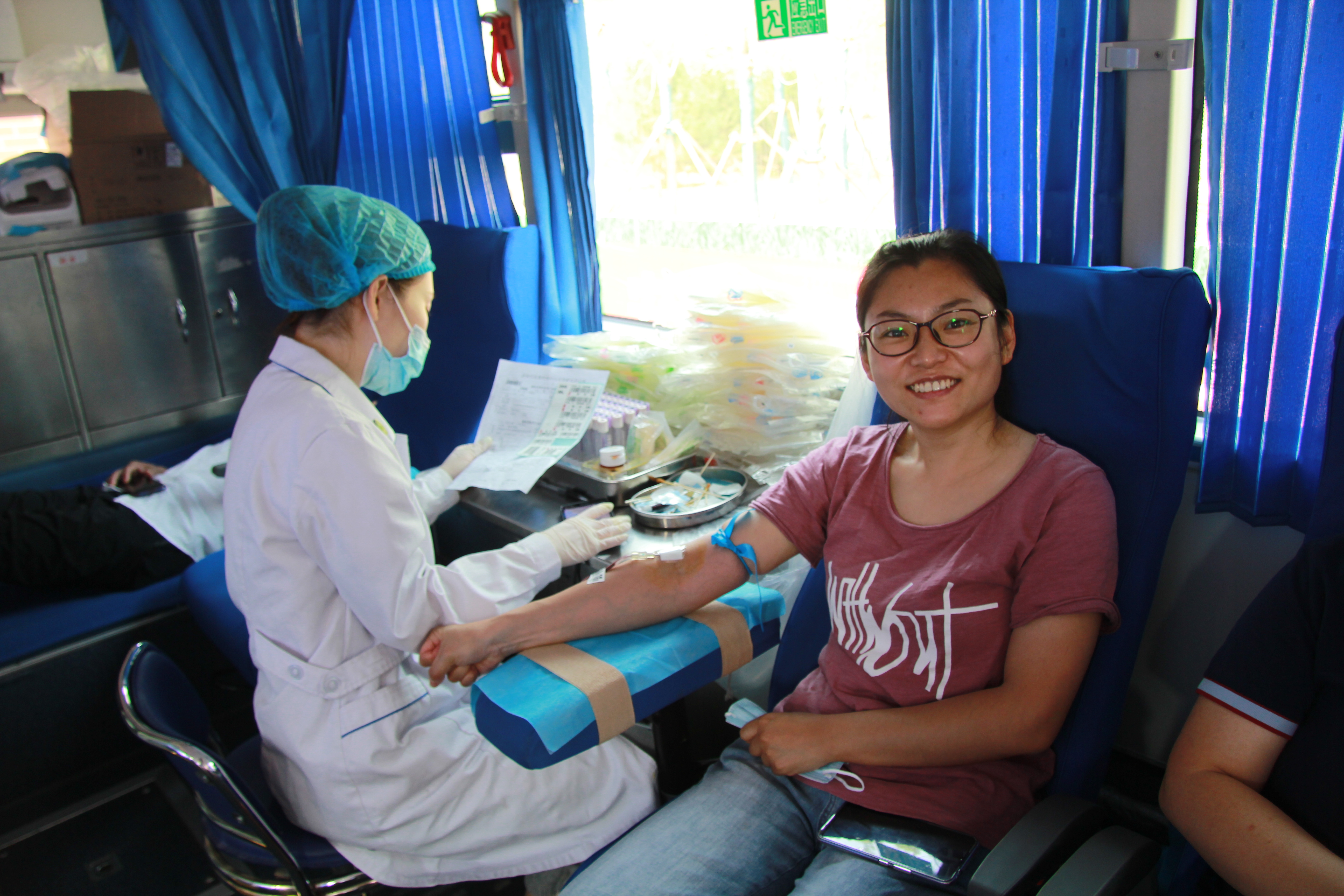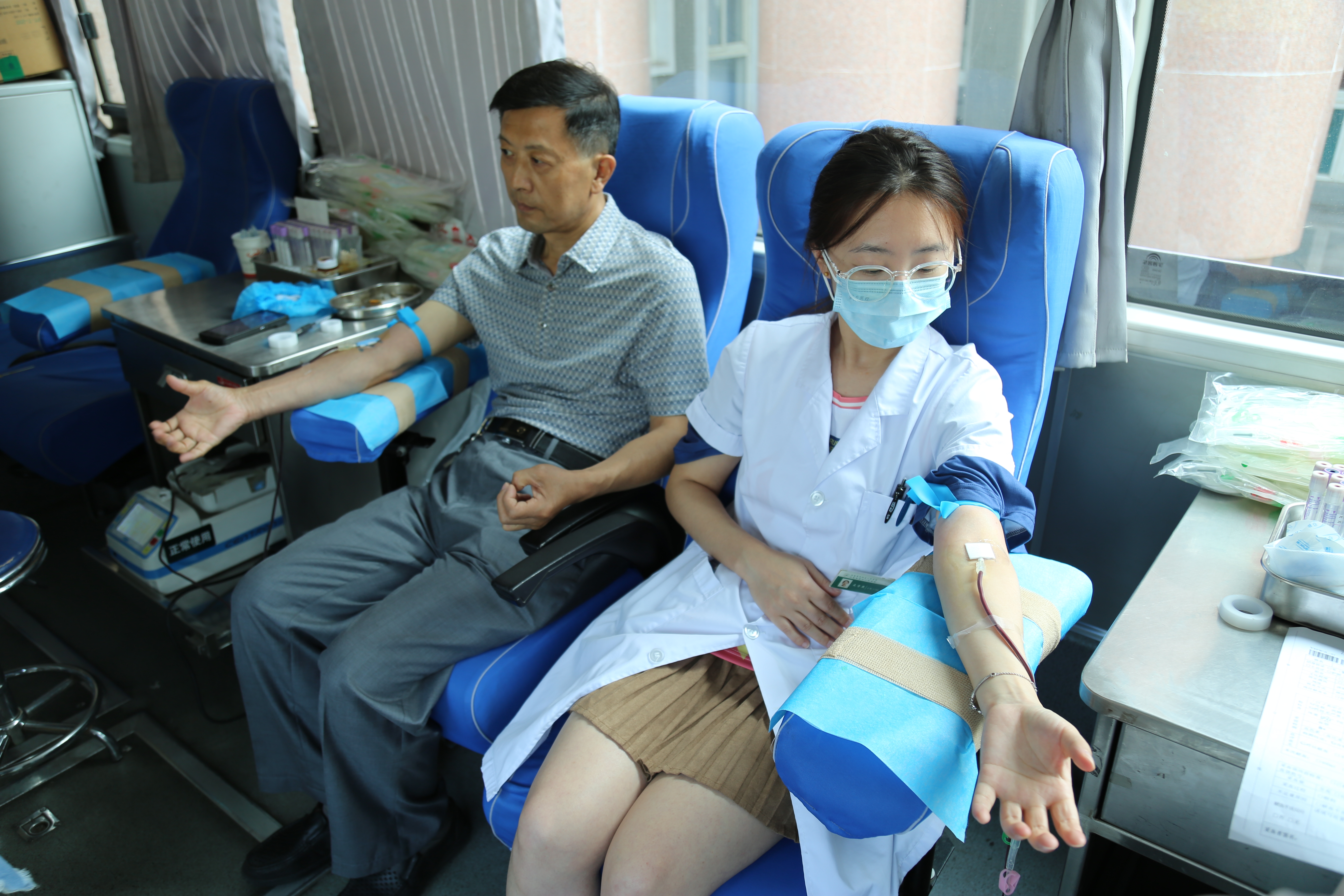 有献血“达人”;还有比翼同行的“夫妻档”, 都是来自医院各个岗位的医务人员。热烈的太阳,火热的心,他们的脸颊挂着汗珠,也洋溢着满满的自豪感。