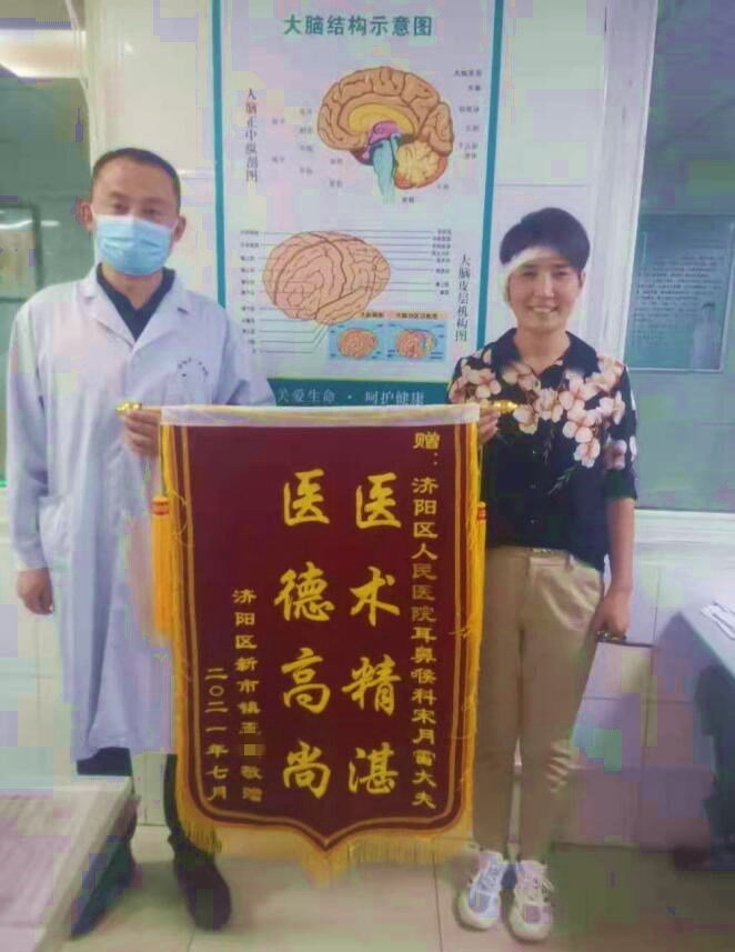 王女士因耳前肿瘤(两处)在外院行两次手术,效果不佳,再次复发。为得到彻底治疗,王女士专程来到我院耳鼻喉科门诊就诊。宋医生详细了解患者病情,为其制定了周密的手术方案。手术一切顺利,住院期间,宋医生及时查房了解患者术后恢复情况。对于宋医生的尽职尽责,王女士深受感动,7月1日出院当天,特定制一面锦旗送到宋医生诊室,以示感激之情。