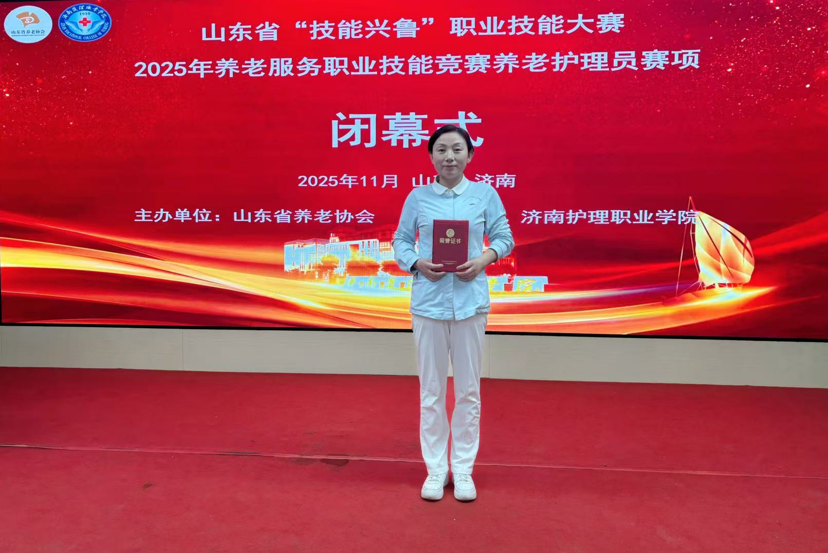 11月14日,由山东省养老协会主办的山东省“技能兴鲁”职业技能大赛2025年养老服务职业技能竞赛养老护理员赛项在济南护理职业学院圆满落幕。我院医养服务中心朱月娥经初赛、决赛层层考核,凭借扎实能力斩获全省三等奖。
