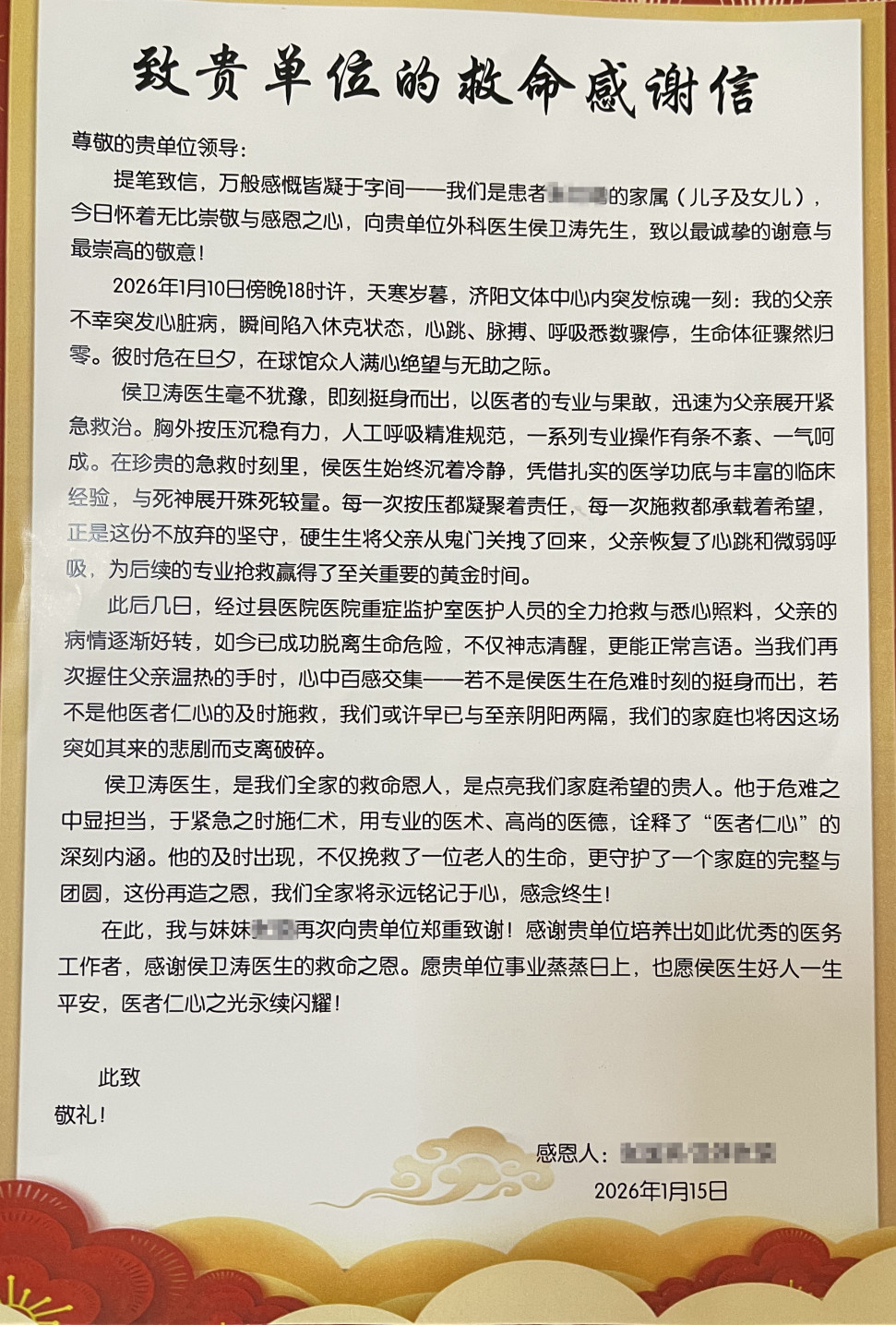 患者家属于信中写道:“感谢贵单位培养出如此优秀的医务工作者,他于危难之中显担当,于紧急之时施仁术,用专业的医术、高尚的医德,诠释了‘医者仁心’的深刻内涵”。信中字字句句都饱含着对济阳区人民医院的由衷赞美,以及对侯医生、ICU医护人员救命之恩的感谢。