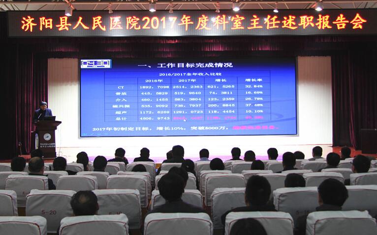 述职报告会分门诊、医技及临床科室三部分进行,分别由分管领导张玉海副书记、唐清颖副院长、高峰副书记主持。会上,来自临床、医技及门诊科室的39名科主任围绕年初医院及科室制定的工作计划,从年度工作目标完成情况、学科建设、科研成果、工作满意度、医护院感病案质量、本年度工作不足及原因分析、2018年工作计划、目标等方面用PPT的形式进行了直观详细介绍。