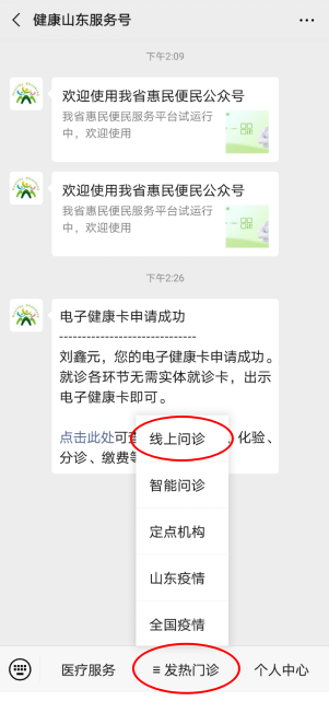 进入公众号,点击下方“发热门诊”菜单下的“线上问 诊”