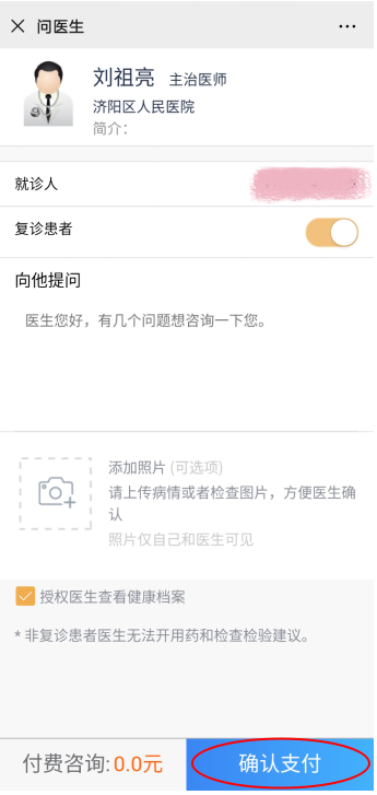 根据自身情况进行提问(可添加必要的图片),最后“确认支付”完成线上问诊