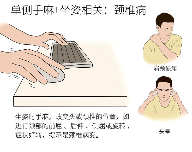 2.颈肩酸痛可放射至头枕部和上肢,有的伴有头晕,房屋旋转,重者伴有恶心呕吐,卧床不起,少数可有眩晕,猝倒。有的一侧面部发热,有时出汗异常。肩背部沉重感,上肢无力,手指发麻,肢体皮肤感觉减退,手握物无力,有时不自觉的握物落地。