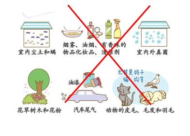 吸入过敏原:室内如尘螨、动物毛屑及排泄物、蟑螂、真菌等;室外如花粉、真菌等。