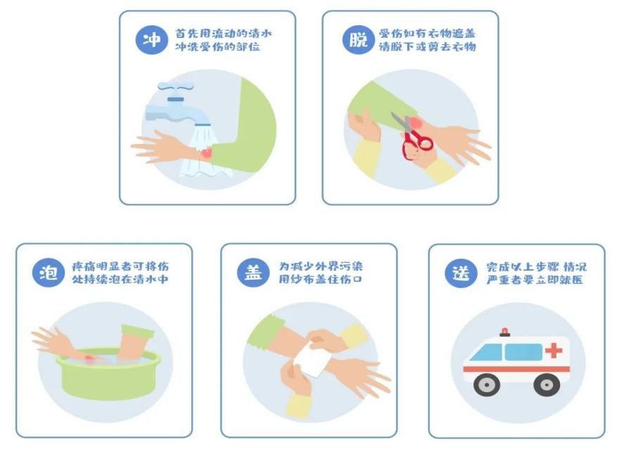 一、急救黄金10分钟:牢记“冲、脱、泡、盖、送”五字诀