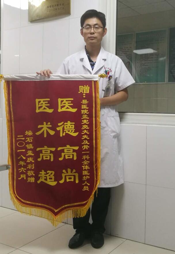 术前,医护人员一刻也不曾放松,积极治疗患者颅脑损伤、胸部损伤,患者病情稳定,术前准备就绪,手术开始。术中,董孟政主任医师、高长明副主任医师精细操作,孟宪亮主治医师与张新医师紧密配合,历时近7个小时,顺利完成手术。术后,骨一科医护人员精心治疗、悉心护理,患者逐渐恢复。出院之际,患者家属特地送上一面写有“医德高尚 医术高超”的锦旗,以示感谢。