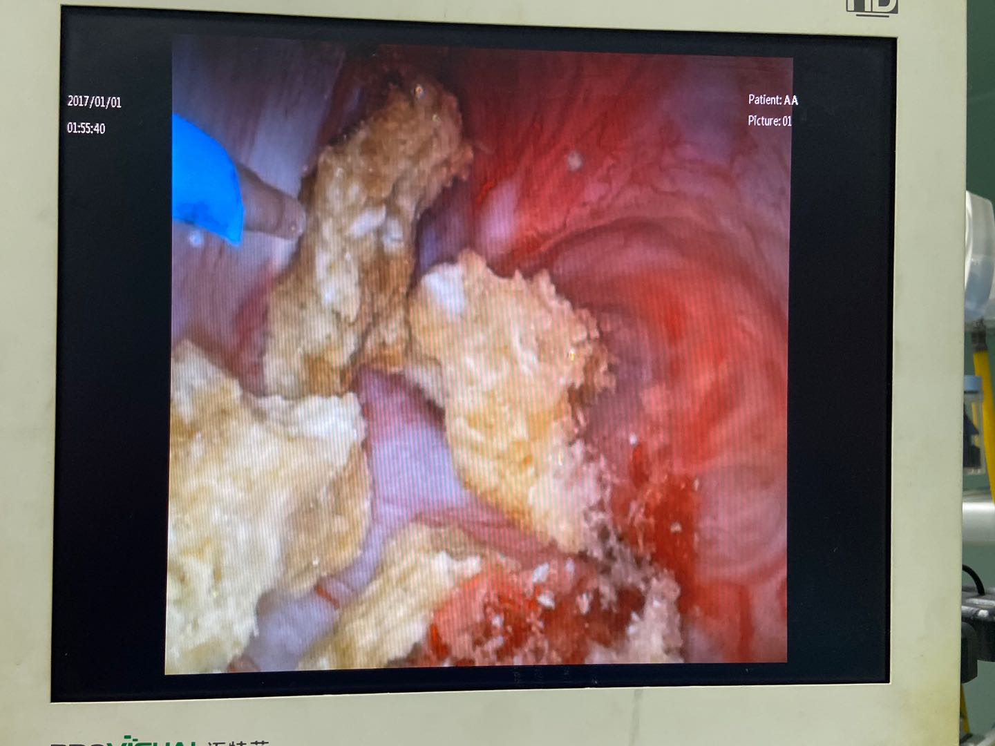 刘某某因长期留置尿管形成膀胱内直径4cm大小结石于28日接受膀胱结石钬激光碎石术。手术历时1.5小时,钬激光将膀胱结石粉碎,取石钳完整取出。术后4天康复出院。 |