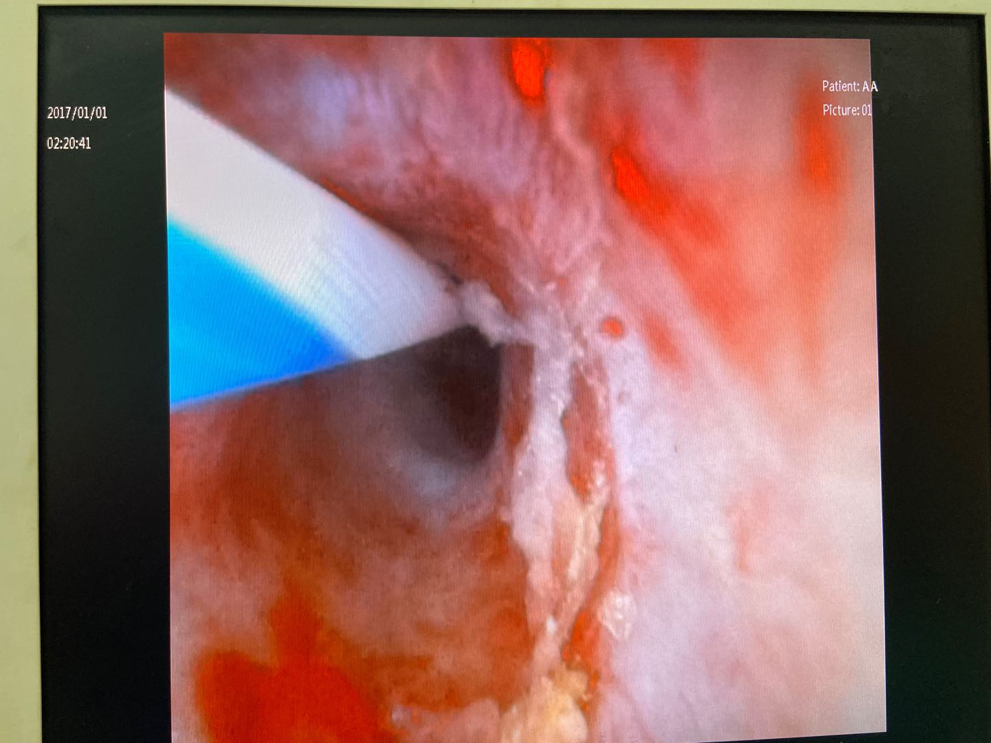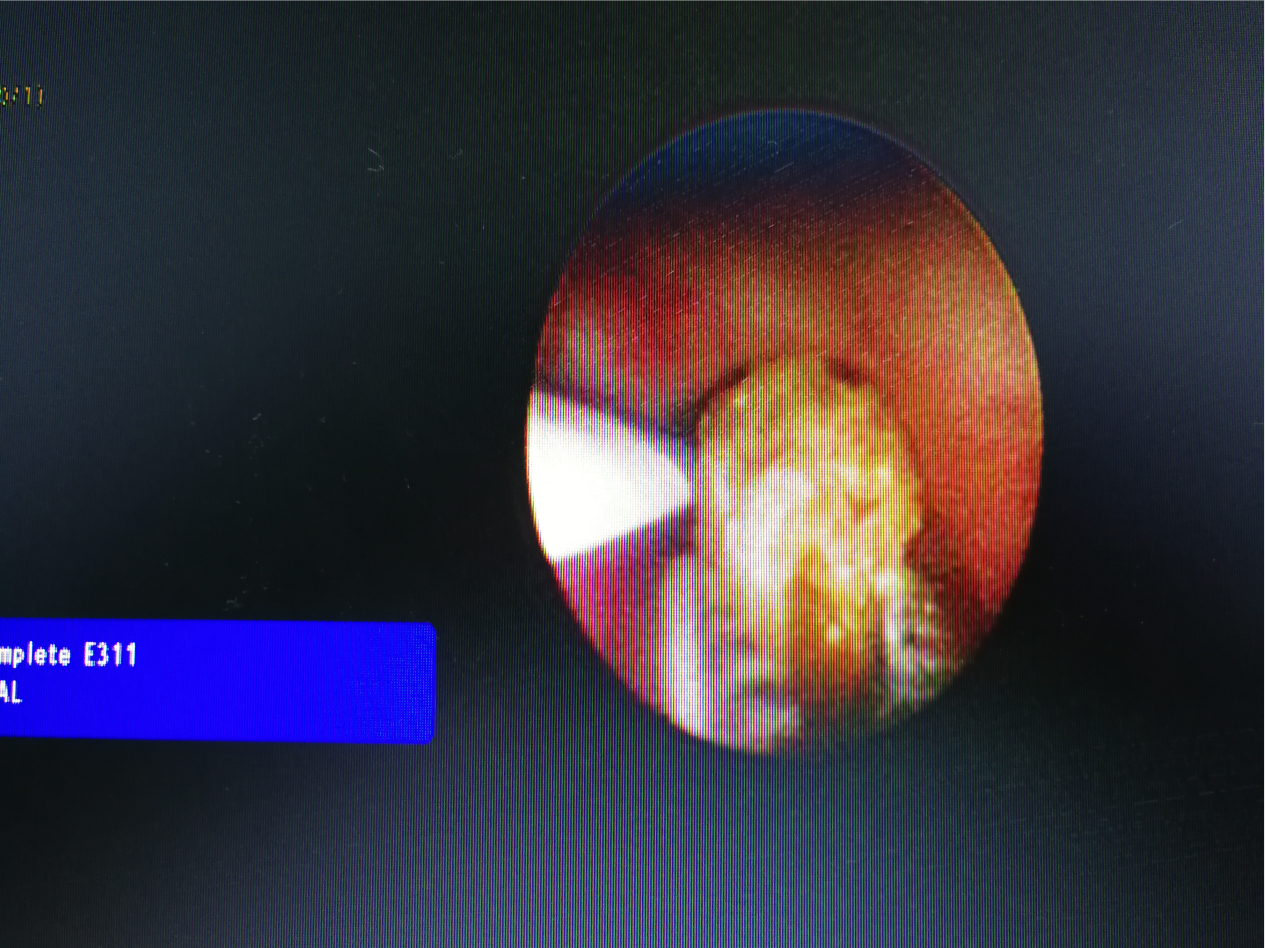 患者左某某,因左侧输尿管上段结石(1.5×1cm)由内科转入。为其行全麻下左侧肾盂结石钬激光碎石术。因患者术中镜下显示左侧输尿管上段狭窄,进境困难,手术人员将输尿管结石推至肾盂内,钬激光将结石粉末化,待其术后随尿液自行排出,手术历时2小时。术后恢复顺利。 |