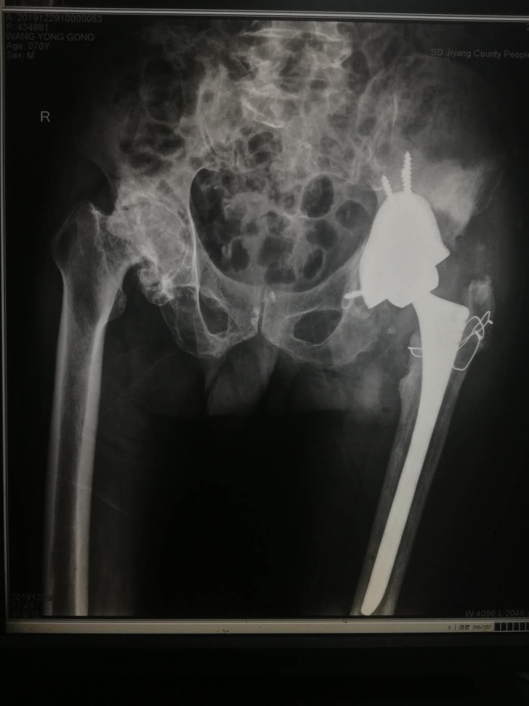 患者,王某某,男,70岁,6年前因股骨头坏死在区人民医院行人工全髋关节置换术,最近感髋部疼痛来院复查,拍片发现人工关节假体出现松动,髋臼假体已移位。入院后经CT等检查发现患者髋臼侧骨质有大量缺损,难以包容髋臼假体。董孟政主任医师组织全科进行会诊讨论,认为手术难度很大,请教省立医院骨科王先泉主任,决定采用3D打印技术辅助手术治疗。利用髋臼CT扫描的数据,用3D打印了机打印出一个与患者患病骨盆完全相同的骨盆模型,进一步确定骨缺损程度,再根据缺乏的部位、范围订制适合病人的异型髋臼假体。手术医师先在模型上模拟手术操作,经过反复计划模拟后 为病人实施了关节翻修术。手术顺利,术后病人很快恢复,随访时已能负重行走,对治疗效果满意。