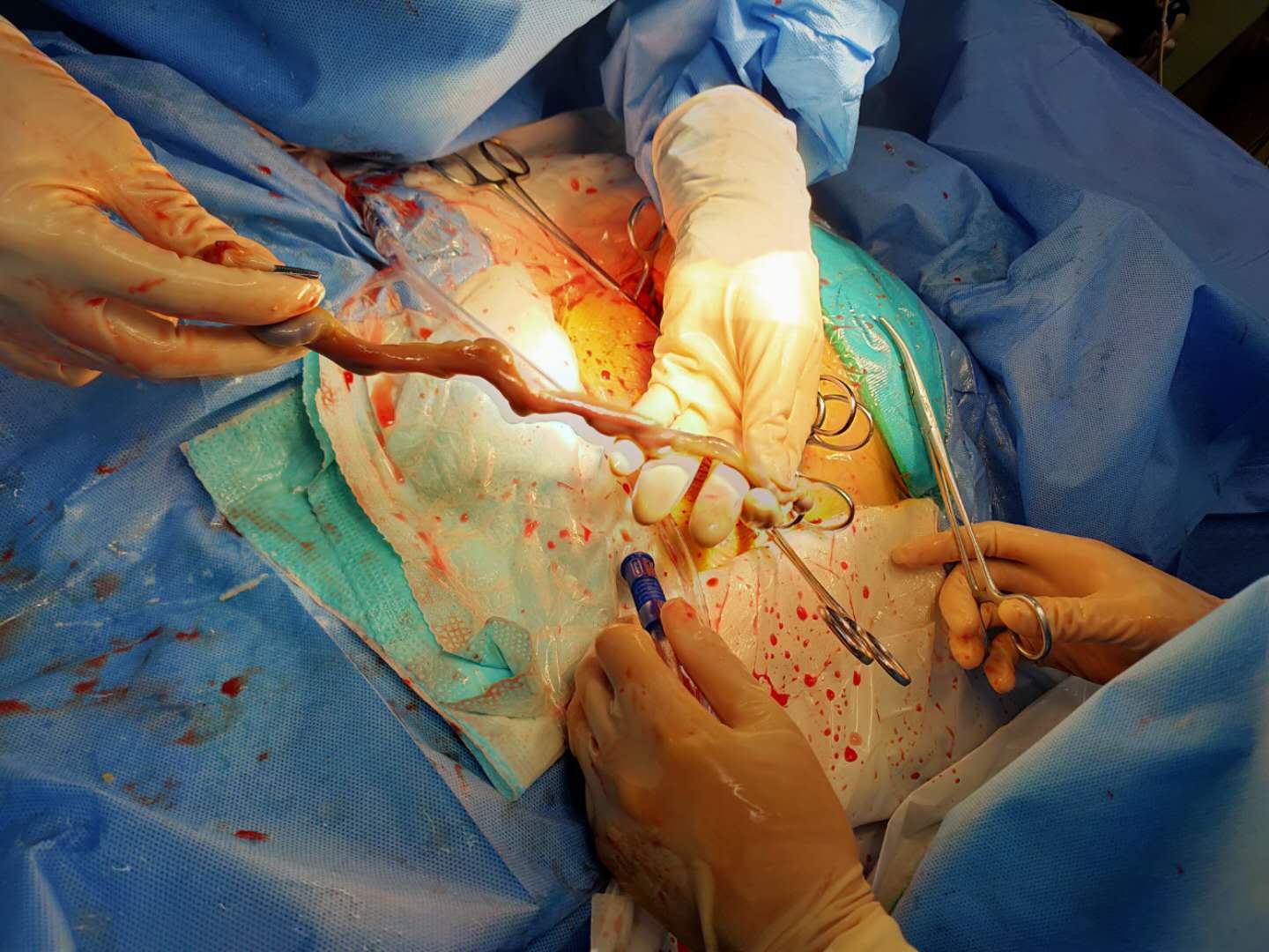 胎儿宫内缺氧,必须尽快娩出胎儿!张医生立即向上级医师汇报病例。孙中芳医师为其急行剖宫产,同时做好新生儿窒息抢救准备,娩出壹女婴,新生儿反应好。