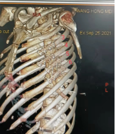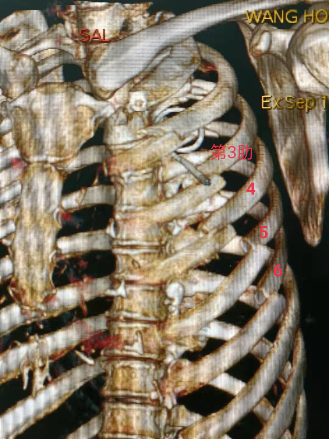 治疗1周后,患者病情趋于稳定,请胸外专业副主任医师任军会诊,患者左胸2-6肋骨骨折断端明显错位,按压有骨擦感,咳嗽时有骨擦音,局部胸壁有塌陷、连枷胸,疼痛明显,应行手术治疗恢复胸廓的完整性,减轻患者疼痛。遂转入综合外科胸外专业组,同时请神经外科、普外科、心内科共同会诊评估患者身体条件是否耐受手术。为缩短手术时间,胸外科专业组决定采用胸腔镜辅助下左侧肋骨骨折切开复位钢板内固定术,恢复胸廓的完整性。骨折断端刺入胸腔,上叶部分肺组织与前胸壁粘连,与骨折断端皮肤表面取小切口,对主要错位明显骨折的肋骨进行切开解剖复位及固定,胸部切口长约5.5cm,术中清除胸腔内积血约500ml,手术历时1小时,过程顺利。