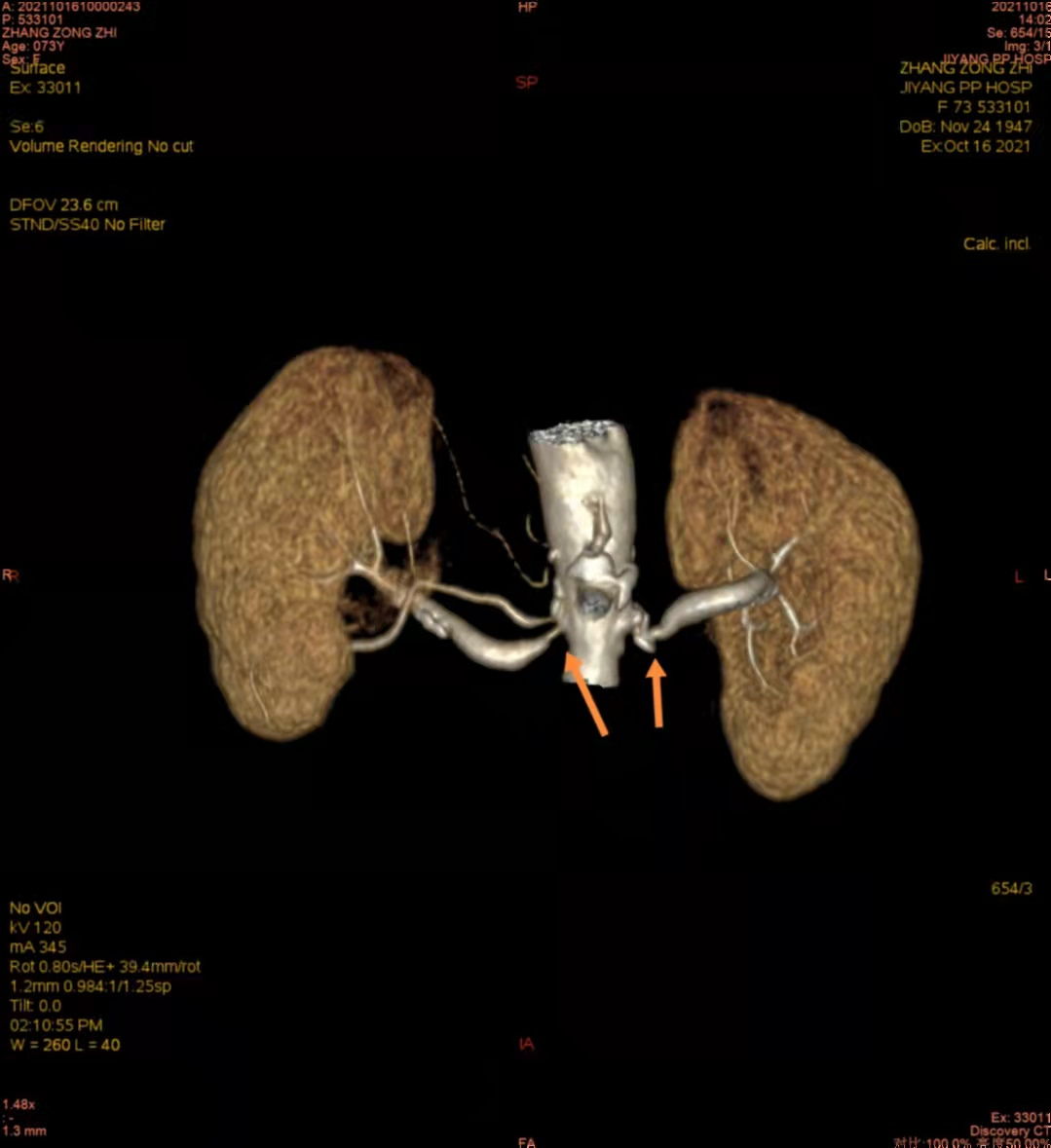 注:CTA下右侧肾动脉重度狭窄;左侧肾动脉起始段混合