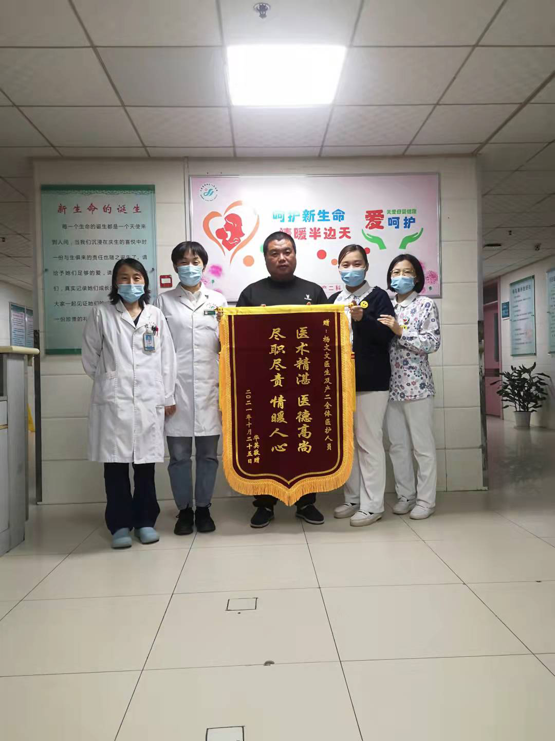 手术顺利过关,但术后仍不能掉以轻心,杨医师及产二的医护人员,及时跟进术后母儿情况,适时调整治疗方案,在大家的呵护下,华女士恢复很快,小家伙也指标良好。入住产二期间医护人员的所有付出和关心,华女士家人都看在眼里,记在心里,就赶制出这面鲜艳的锦旗以表谢意!
