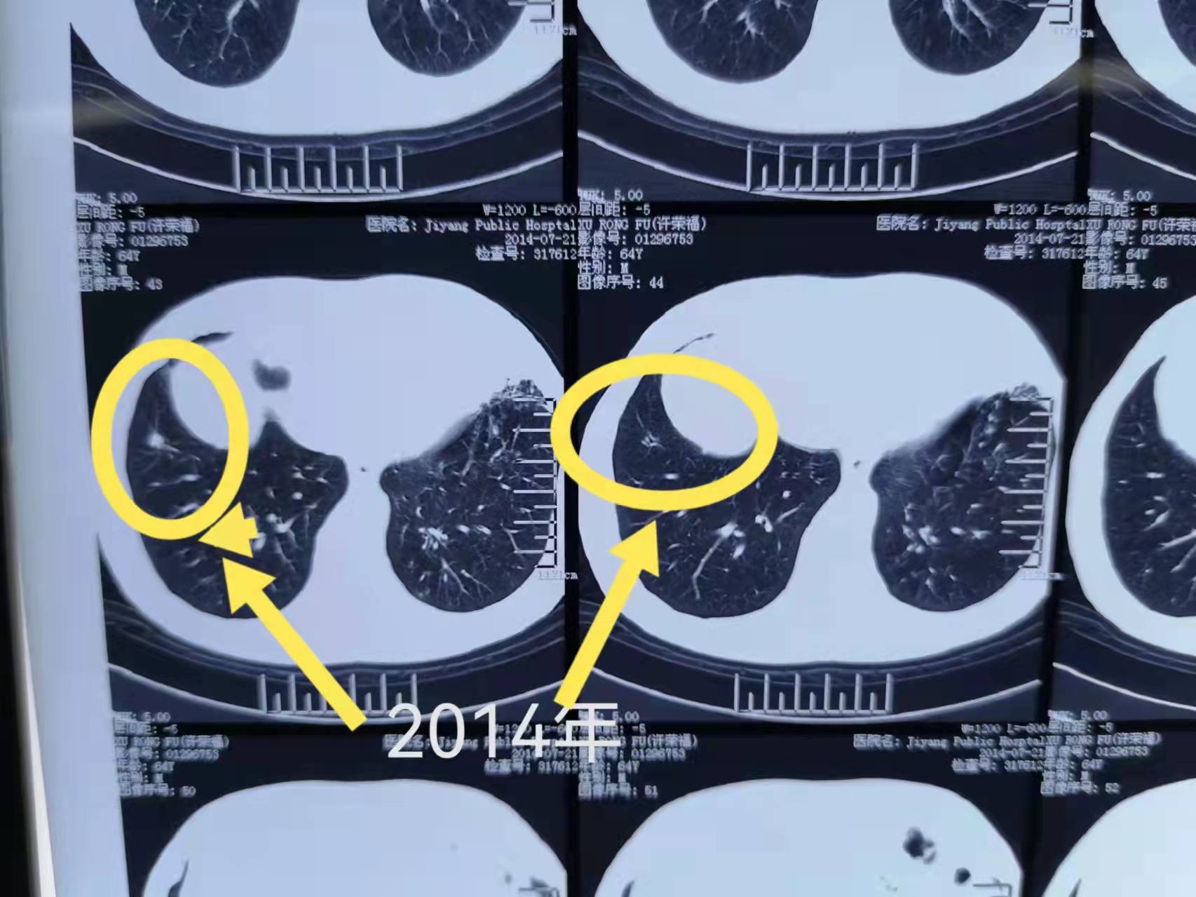 患者许大爷,自2014年发现右肺下叶结节灶至今7年,曾于2016年、2018年及2021年分别行胸部CT复查,结节灶位于右肺下叶前基底段,由原来的1.0增大至1.6cm,边缘分叶、毛刺,内见空泡征,贴近脏层胸膜。