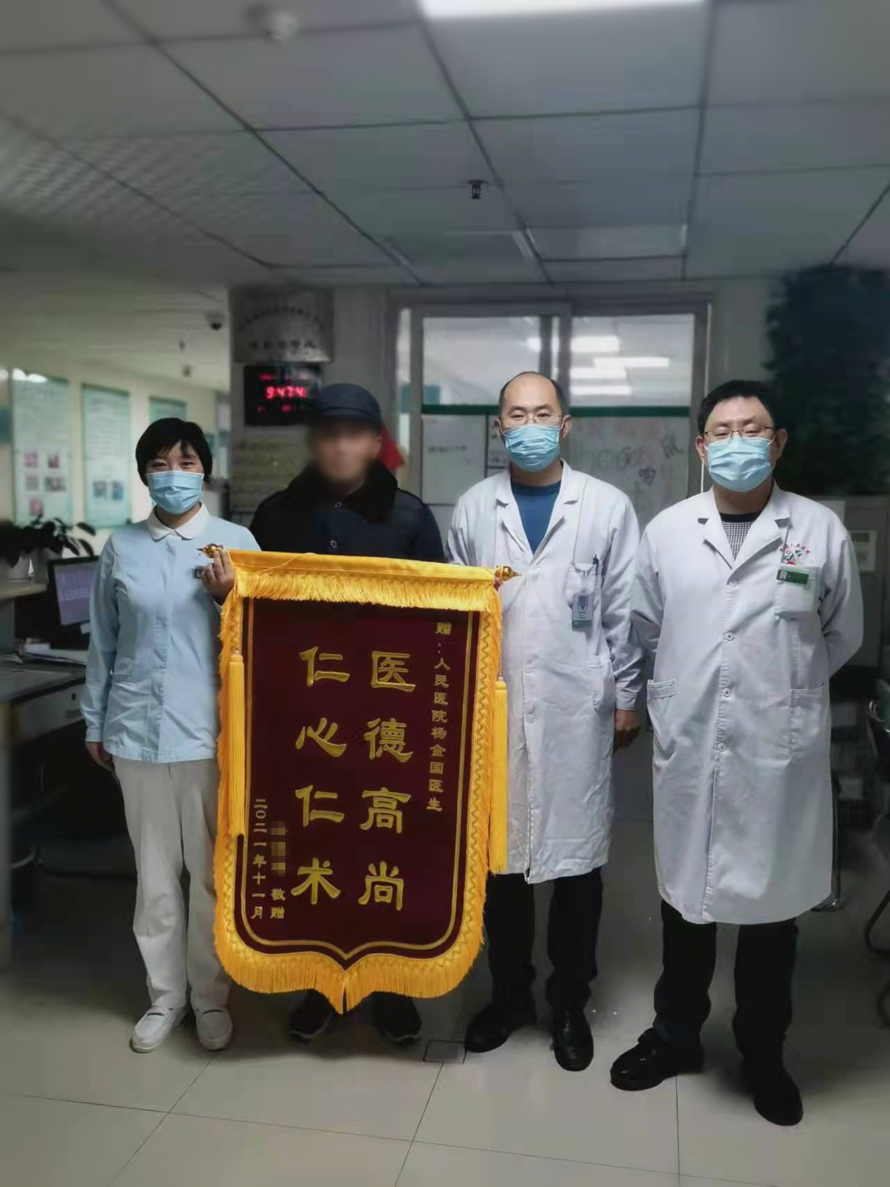 住院期间,患者及其家属对杨医师多次表达谢意,并送上红包,被其回绝。他说:“治病救人是我们作为医生的职责,把病治好是我们共同的责任和目标,你们的支持和认可就是对我最大的帮助,我应该谢谢你们才是。”一句句简单的话语拉近了医患间的距离,一句句贴心嘱托建起了医患间的信任桥梁。11月15日,患者来院复查,恢复良好,送上锦旗以表谢意。