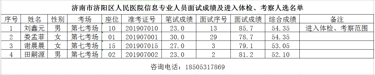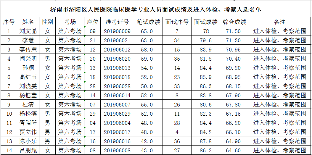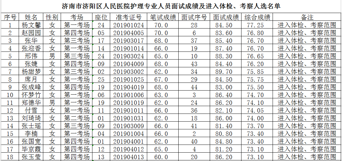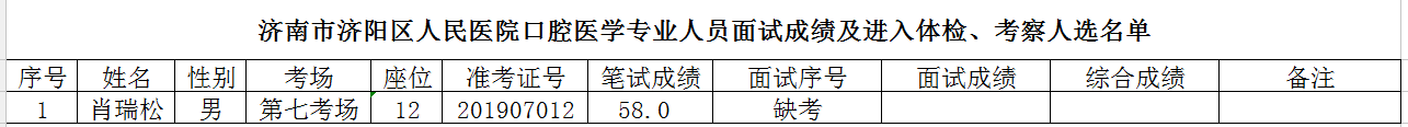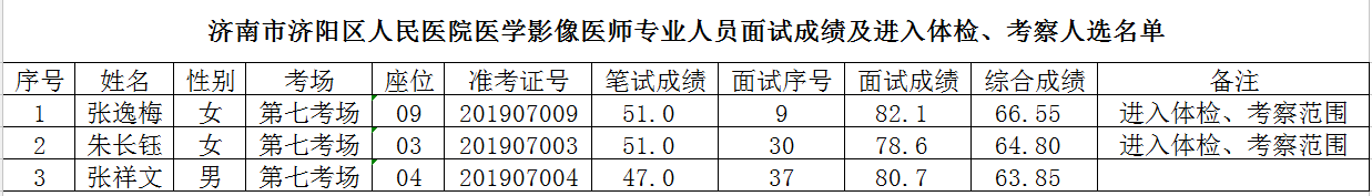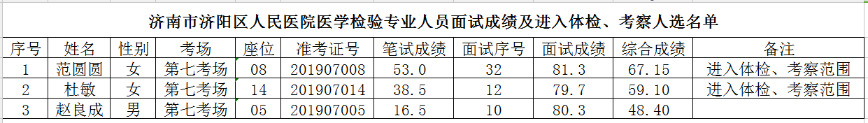 济南市济阳区人民医院招聘人员面试成绩及进入体检、考察人选名单