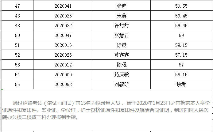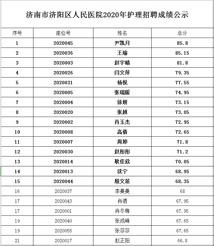 济南市济阳区人民医院2020年护理招聘成绩公示