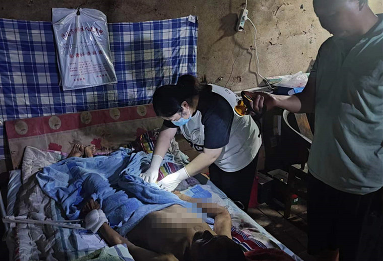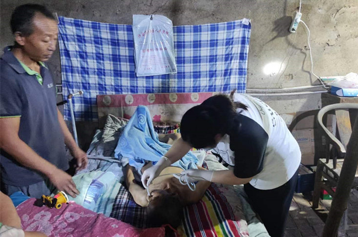 当天下午下班后,忙碌得工作已让自己饥肠辘辘,但考虑到患者的情况,也顾不上这些,王丹丹护士一行按约定时间赶赴垛石街道患者家。18:20终于到达患者家中,家属早已撑伞等在家门口:“护士,太感谢了,又麻烦你们了。”王丹丹护士对患者进行全面评估,由于赵奶奶因脑出血,大脑意识受影响,对家人的护理操作不能积极配合;但对王护士的声音却很敏感,从住院期间就这样,只要听到王护士的声音,她就会安静下来。这次插胃管也是,王护士对家属说:“还是让我来试试吧…………奶奶,你听我的话,不要乱动,我让你吞咽的时候你就咽一下,这样咱一次就成功了,好不好?”奶奶竟然真的配合了,操作也一次成功,家属激动地说:“护士,你技术太好了,住院期间就知道你是一个经验丰富的护士,老人少受罪了,谢谢你!”随后王护士又为家属针对留置胃管的注意事项、鼻饲护理的注意事项、如何预防血栓、肢体的功能锻炼进行了详细讲解。
