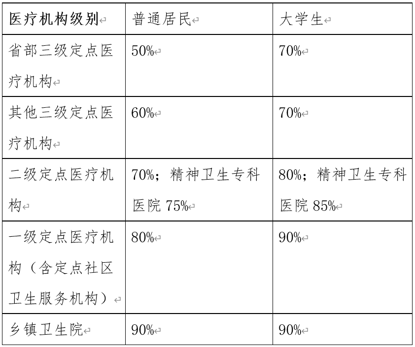 注:尿毒症透析治疗,一级及以上定点医疗机构80%,乡镇卫生院90%;恶性肿瘤的门诊治疗、白血病、组织或器官移植(抗排异治疗)、血友病、神经系统良性肿瘤门诊治疗,各级定点医疗机构报销比例低于75%的统一按75%执行;肺结核、肺外其他部位结核、耐多药结核、广泛耐药结核、慢性病毒性肝炎、肝硬化,各级定点医疗机构报销比例低于60%的统一按60%执行。