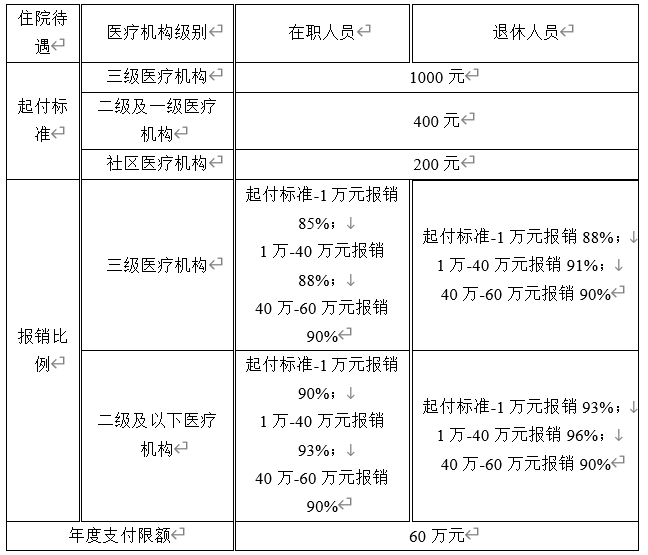 注:1.在一个医疗年度内,第二次住院起付标准降低50%,从第三次住院起不再计算起付标准。