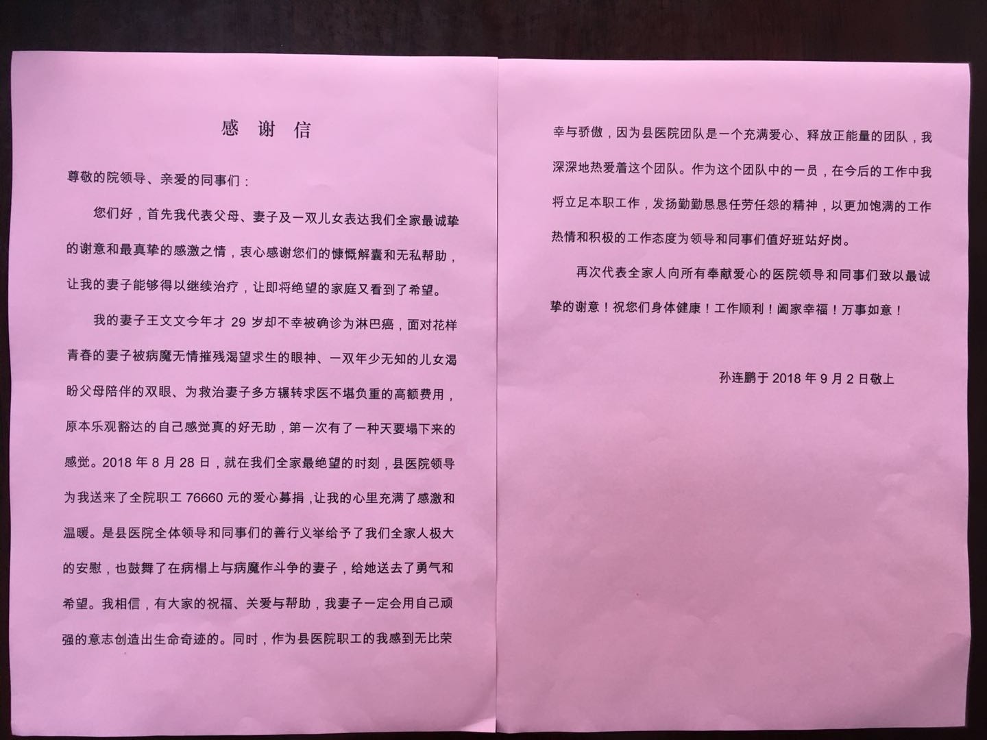 一纸信笺承谢意,句句谢语显真情。9月2日,我院职工孙连鹏将一封感谢信送到了工会主席徐吉兰的手中。他说“我代表父母、妻子及一双儿女表达我们全家最诚挚的谢意和最真挚的感激之情,衷心感谢您们的慷慨解囊和无私帮助,让我的妻子能够得以继续治疗,让即将绝望的家庭又看到了希望。”下午,他的父亲和岳父也一起来到医院,两个老人用自己最质朴的语言表达着对医院不尽的谢意。