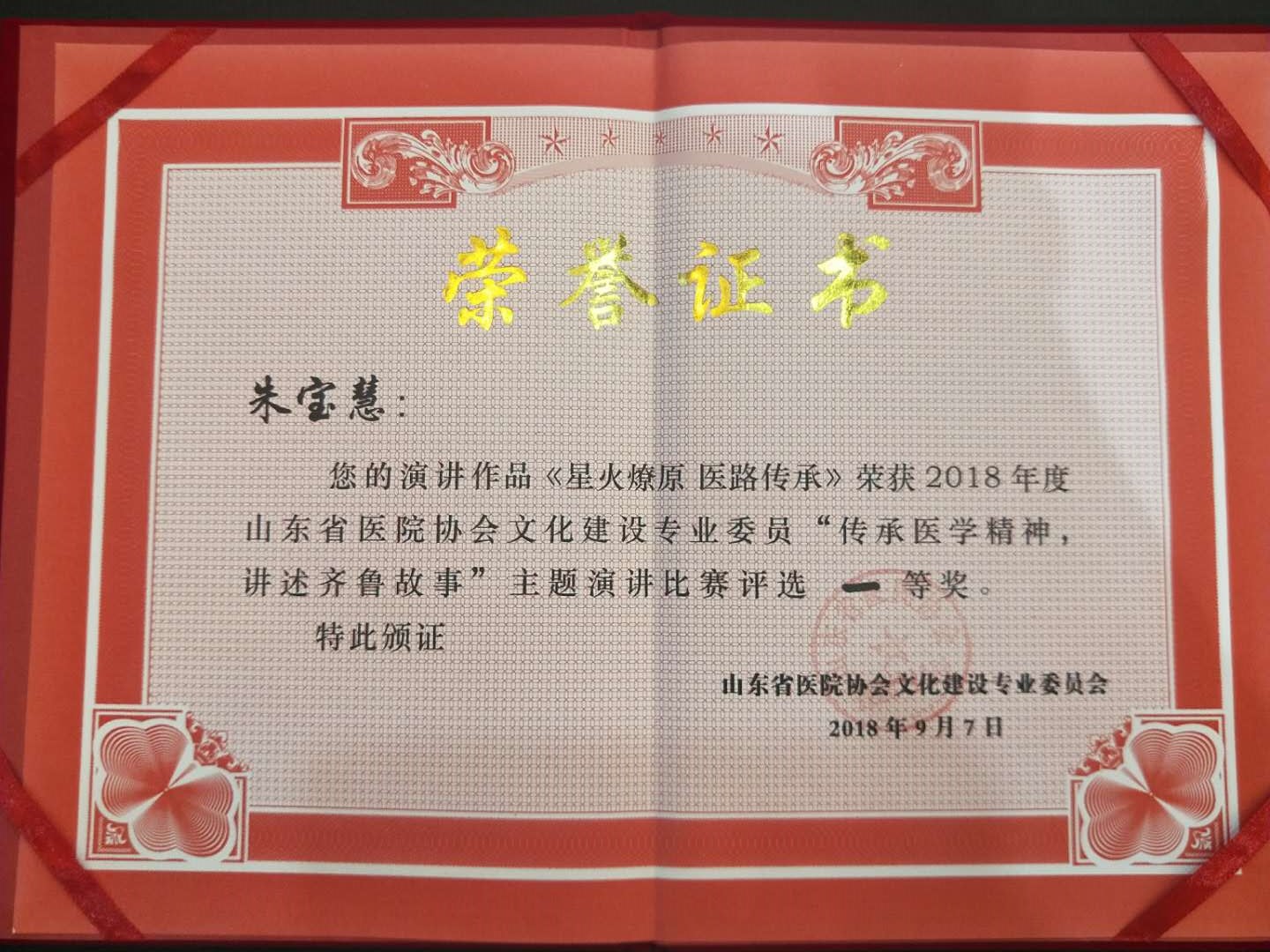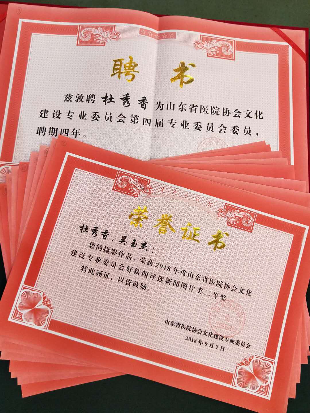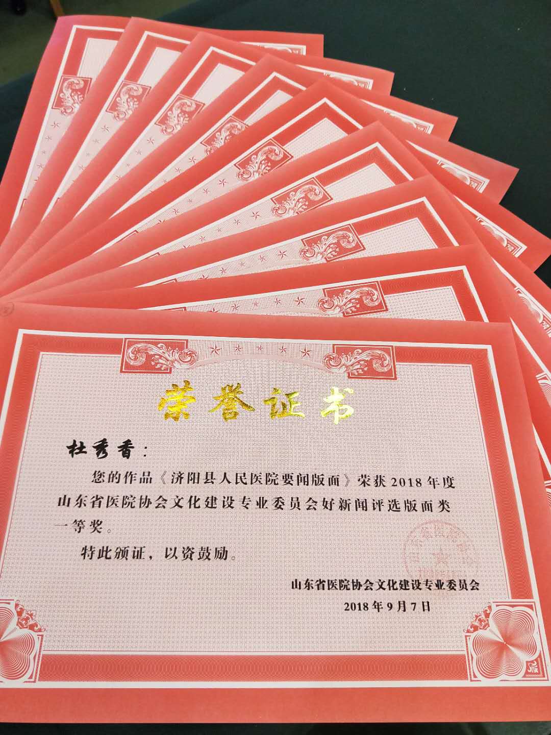 济阳县人民医院宣传科主任杜秀香入选山东省医院协会文化建设专业委员会第四届委员会委员。济阳县人民医院院报要闻版、文艺副刊版分获版面类评选一等奖、二等奖;“危机时刻显身手,只为一句‘母子平安'”,“320斤胖哥成功手术,济阳县人民医院骨一、麻醉联手创新高”双双获得消息类评选二等奖;杜秀香、吴玉杰摄影作品获得新闻图片类评选二等奖;“济阳县人民医院举办庆祝“5·12”国际护士节暨“最美护士”颁奖典礼”,“济阳县人民医院成功完成首例腹腔镜下双侧精索静脉高位结扎术”双双获得新闻图片类评选三等奖;“小圈圈,大作为”,“全市争创‘双百'巾帼文明岗,县医院喜获双丰收”双双获得通讯类三等奖;朱宝慧”获得“传承医学精神,讲述齐鲁故事”主题演讲比赛 一等奖。