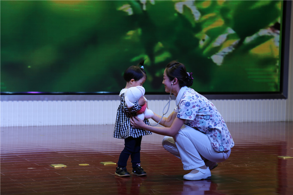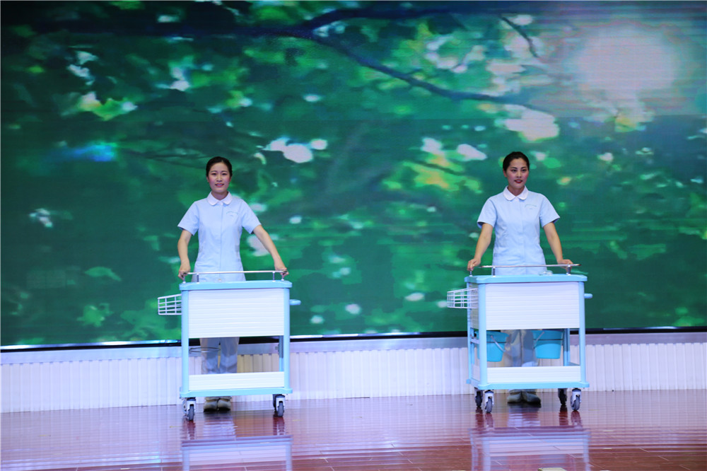伴随着《让世界充满爱》的音乐,六名头戴燕尾帽的护理人员走上舞台,依依不舍地将燕尾帽放到托盘中。
