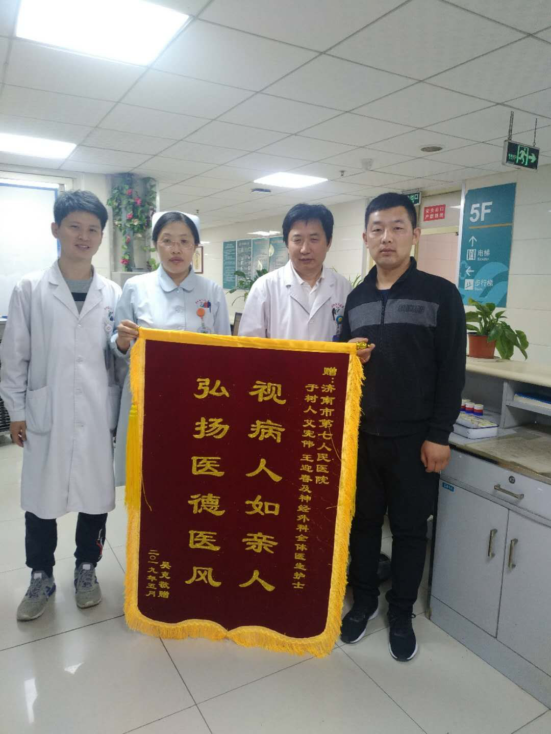 4月6日,吴先生因头疼伴恶心、呕吐两天入院,病情呈加重趋势,询问病史得知其在两天前不慎摔伤头部未及时就医,后经CT初步诊断示:左侧额颞顶枕部、右侧额部颅骨内板下血肿、蛛网膜下腔出血、高血压病,立即给予止血、减轻脑水肿,控制血压等对症治疗,并及时制定了手术方案。当日,责任护士王迎春细致地给予患者术前宣教、完善基础护理,副主任医师于树人、责任医师艾宪伟共同为患者于全麻下实施了左侧额颞顶部硬膜下血肿清除术,术后经过医护人员的精心照料,患者恢复良好。4月29日康复出院,近日借来院复查的机会专门送上锦旗以示感谢。