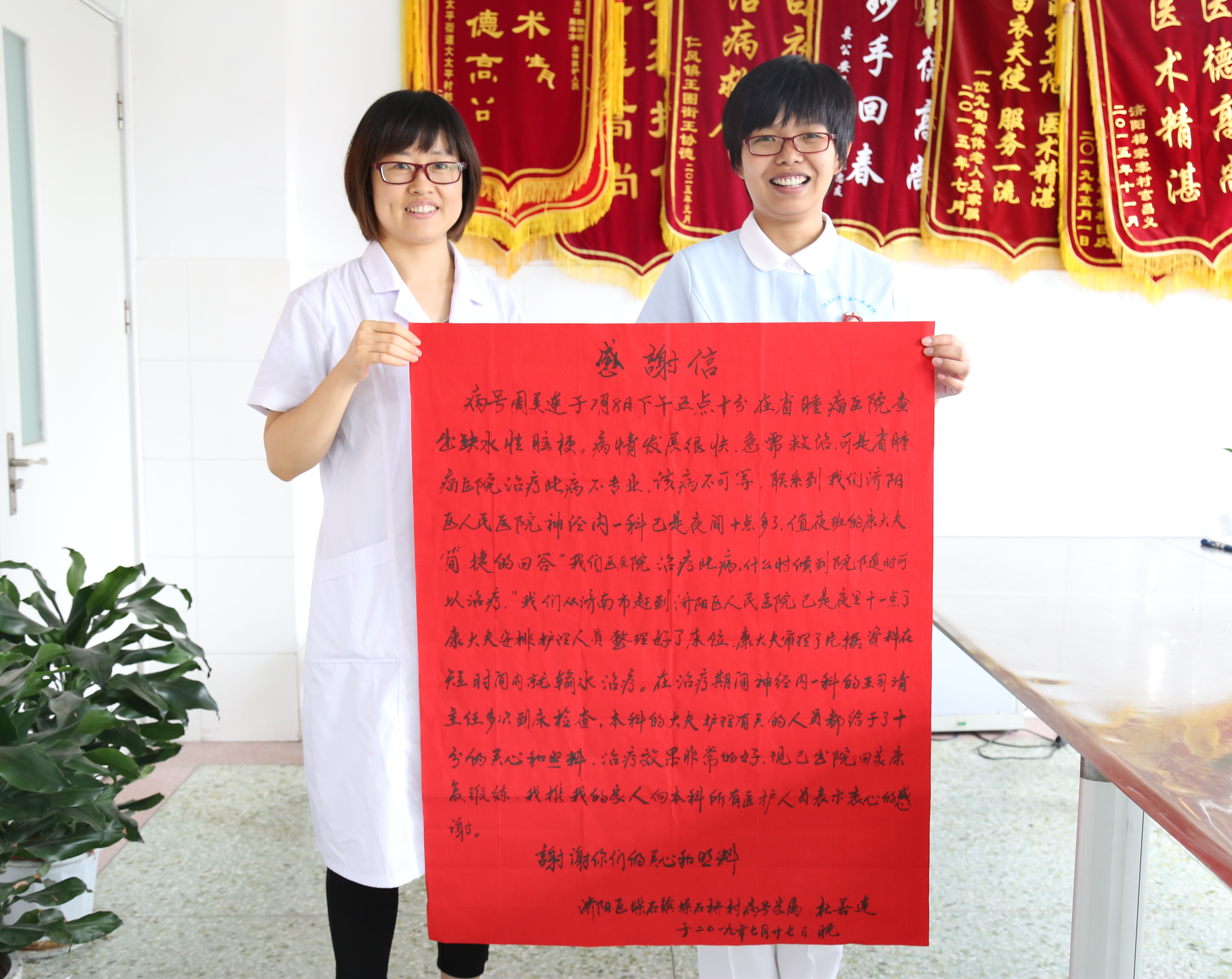 感恩于心,寄情于信。7月29日临近傍晚,风起云涌,垛石镇周女士的家属不顾暴风雨的来临专程赶到区人民医院神经内一科,送上巨幅感谢信,满怀深情的笔墨,诠释着对王司清主任、康云霞医师等全体医护人员精湛技术、精心护理的敬佩之心和感激之情。