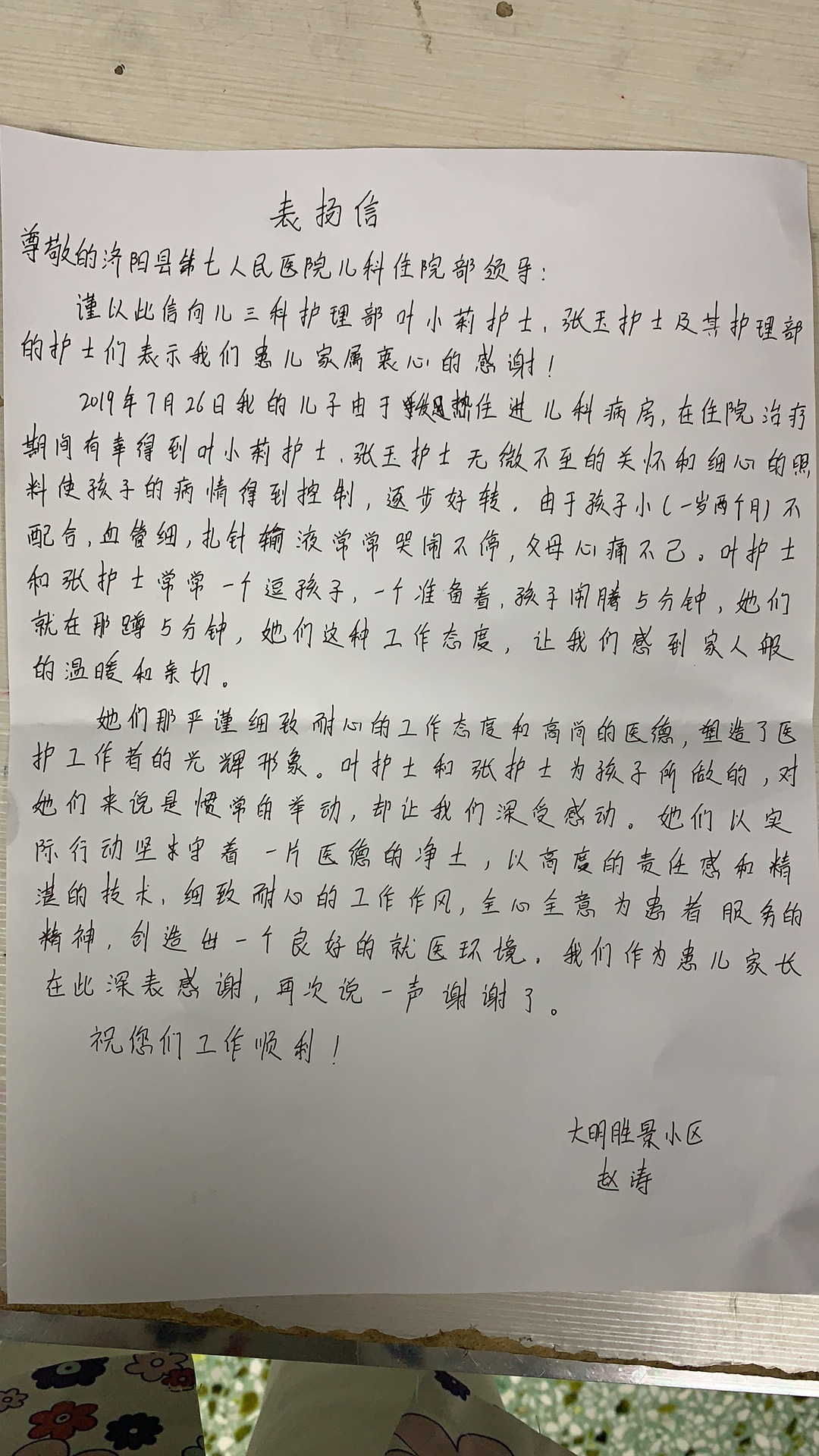 近日,一束鲜花和一封感谢信先后被送到儿三科护士站。原来,几日前患儿黎某某和赵某某分别因支气管肺炎和上呼吸道感染收入儿三科,住院期间责任护士们严格落实“一科一品”服务规范,为患儿家属详细介绍病区环境及各种注意事项等,同时给患儿细致贴心的照顾,患儿病情快速好转,家属感动之余送来鲜花和感谢信以表谢意。