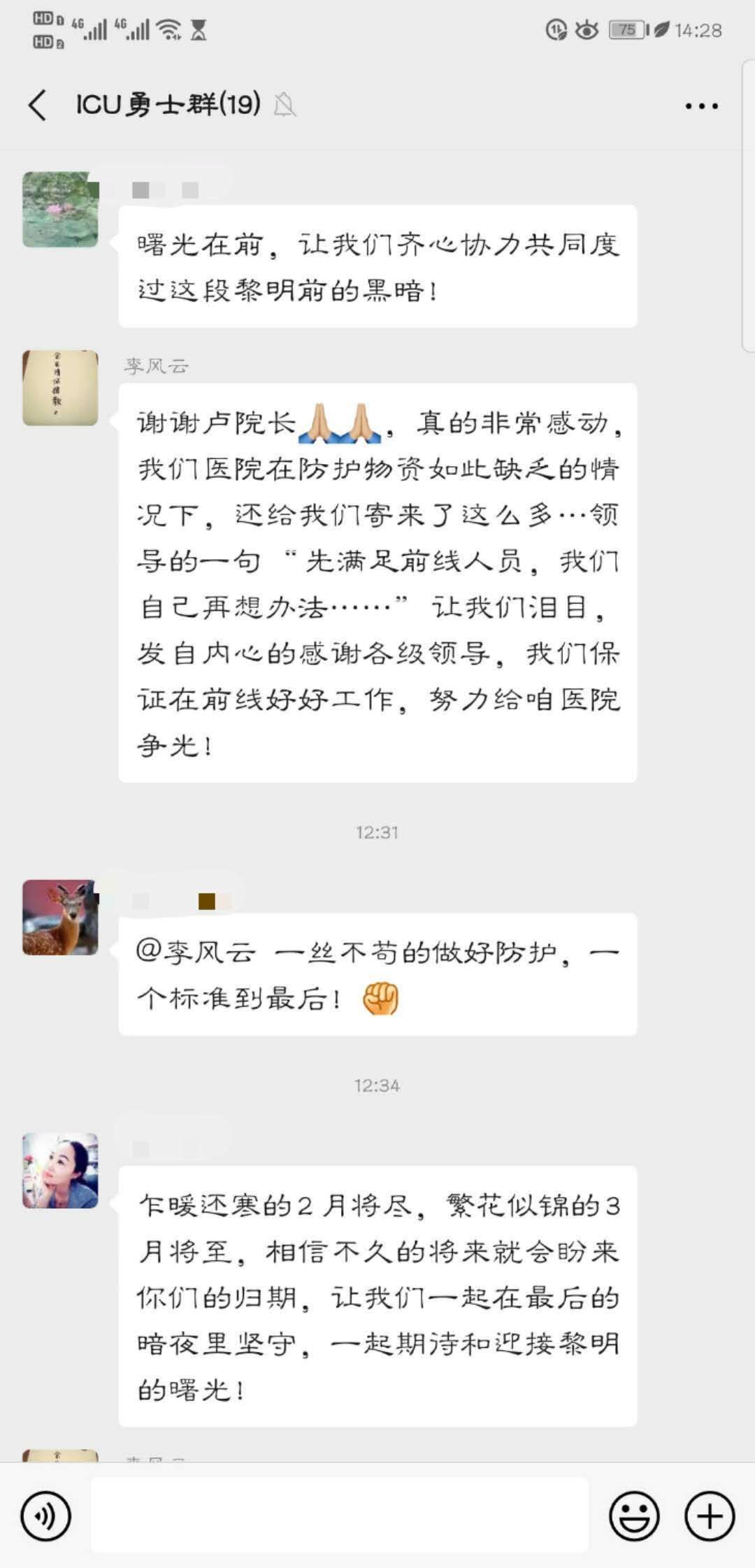 援鄂人员确定后,医院第一时间组建ICU勇士群,医院主要领导、科室负责人、后勤专班成员均在群内,第一时间关注前线动态,由一对一服务人员每天与前方一线人员微信、电话联系,了解一线人员在前线的工作、生活情况,开展交流,疏导压力,给予鼓励、支持和帮助。及时协调保险公司为一线人员赠送保险,切实做好防控一线医护人员精神和物质双重保障,给一线队员最大的鼓励和支持,让他们坚定信心、心无旁骛抗击疫情。