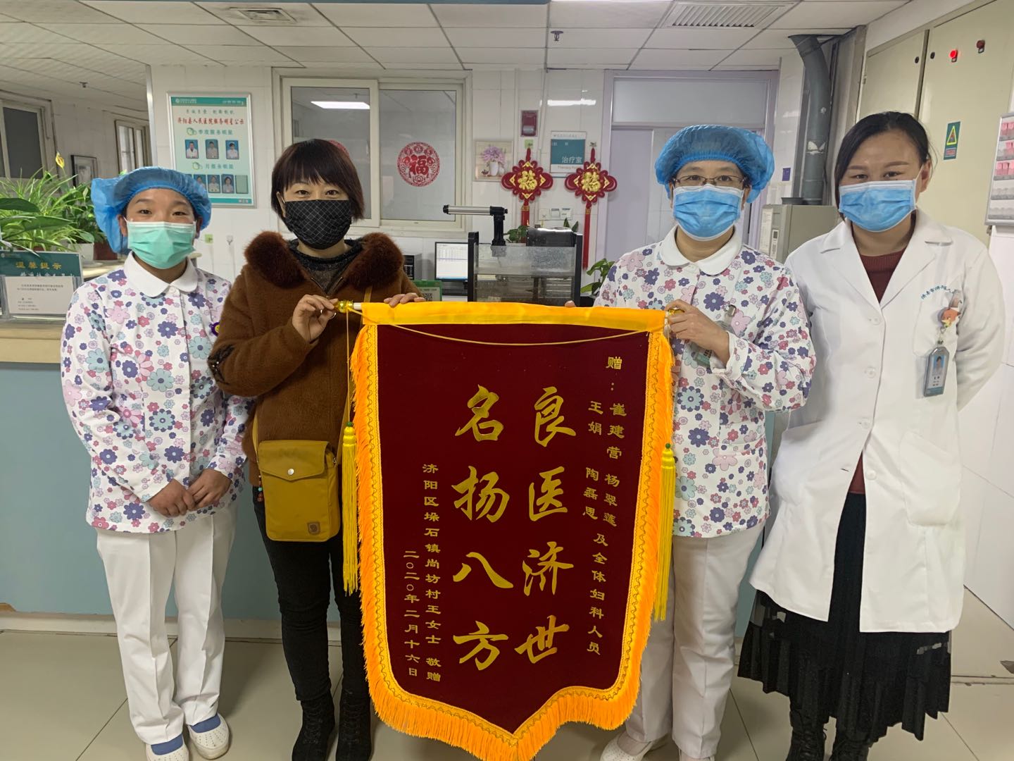 近日,患者王女士委托其女儿将一面写有“良医济世,名扬八方”的锦旗送到了妇科病房护士长手中,并再三感谢崔建营主任,杨翠莲大夫,陶磊思大夫,王娟护士长及全科医护人员对其母亲的精心治疗和悉心照顾。