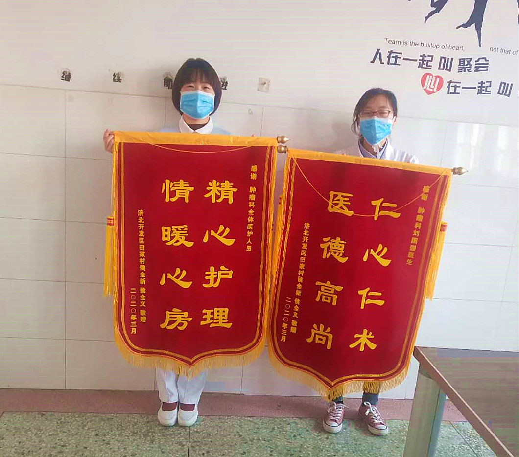 3月27日,肿瘤科患者侯大爷家人将两面锦旗送到刘国强医生手中,一面赞医生“医德高尚,仁心仁术”,一面敬护士“情暖心房,精心护理” ,表达了对医护人员的感激之情。