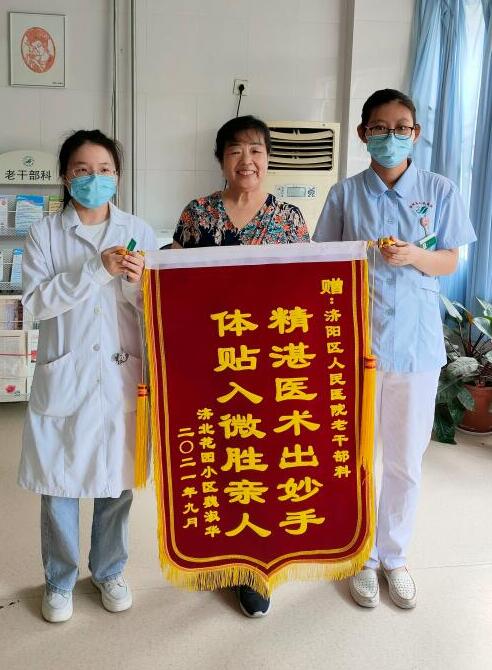 9月2日上午,老干部科患者魏奶奶的家属手捧一面锦旗送到护士长手中,连声说道:“我们今天出院了,谢谢咱科医护人员的精心照顾,你们辛苦。”