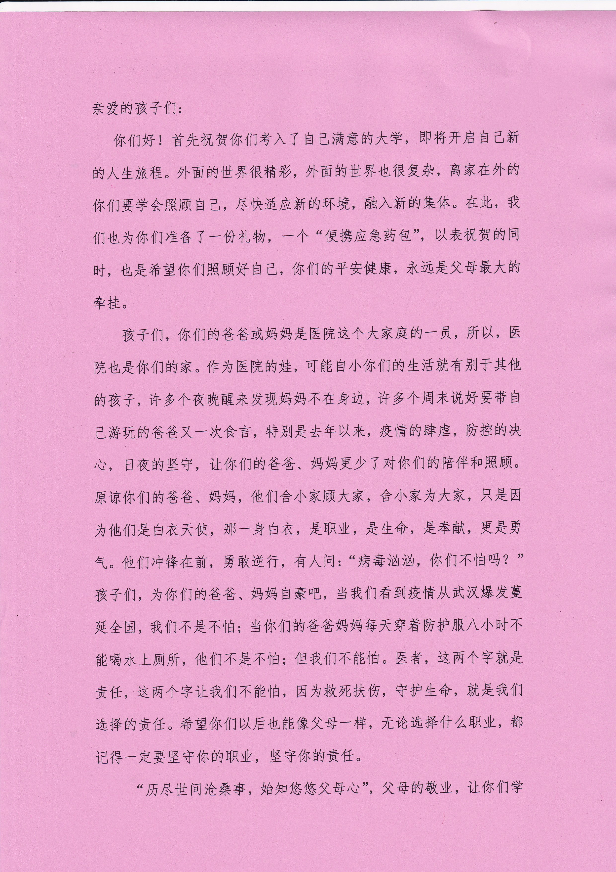 历经火热的高考季,2021年的升学季也如期而至,不同于往年的是我院即将迈入大学校门的孩子们收到了一份来自医院的特殊礼物:一个囊括了内服外用、内科外科各种药物的“便携式应急药包”,一封来自医院领导谆谆善诱、殷殷叮咛的“家书”。其药之全,出乎意料,你想到的,想不到的都在里面;其情之切,感人至深,职工、孩子莫不感激感动。